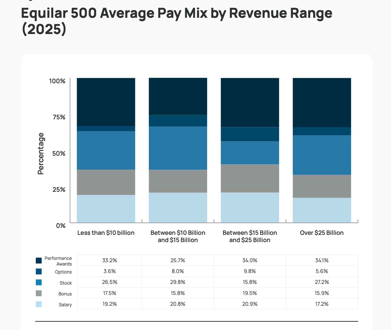 绩效型奖励(Performance Awards)已成为 HR 高管薪酬的核心组成部分,平均占比约 33%。在营收 250 亿美元以上的企业中,绩效股权的中位值超过 100 万美元,较次一级收入区间高出 42%。股票奖励(Stock Awards)普遍为第二大组成部分,占 26%–30%;基本工资与奖金保持稳定,占比 17%–21%。相比之下,期权(Options)在所有规模企业中均处于低位,占比不足 10%。这表明,美国企业正将更多薪酬与绩效结果直接挂钩。