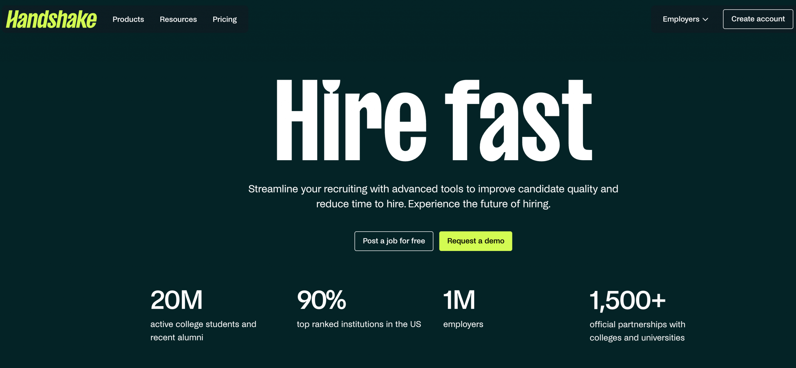 Handshake 成立于2014年,以大学就业服务起家,通过与 1500多所高校 建立合作关系,为 2000万名学生与校友 提供求职、实习与早期职业发展支持。它曾帮助无数年轻人迈出职场第一步,也成为美国校园招聘的标配系统之一。