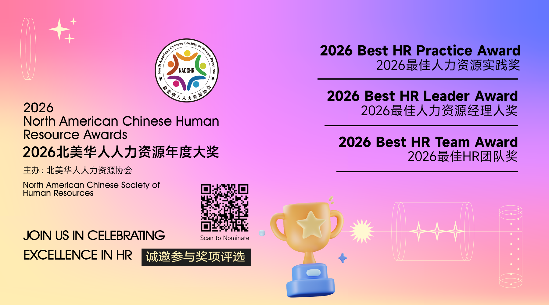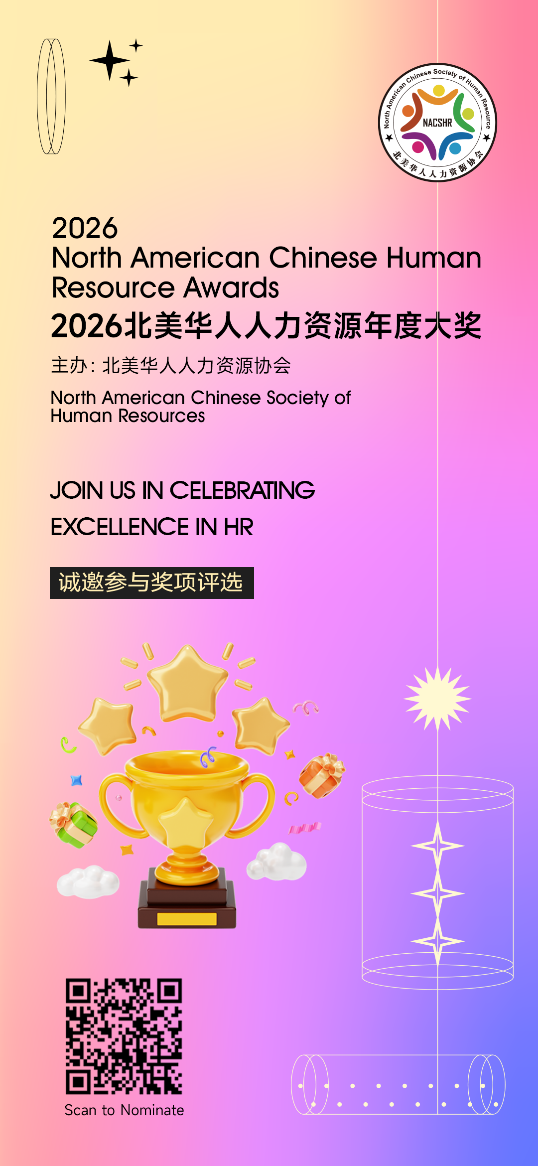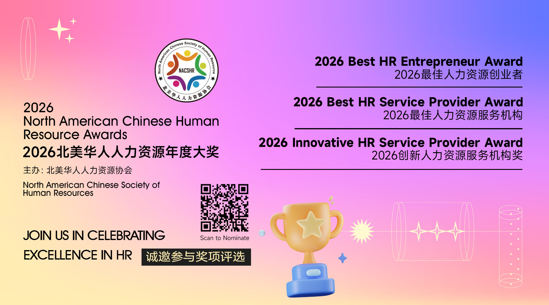 Founded in 2016, NACSHR has been committed to building a platform for professional exchange and growth among Chinese HR practitioners. Our goal is to better support and connect Chinese HR professionals and workplace contributors across North America. Through this annual awards initiative, we hope to uncover and celebrate exemplary individuals, teams, and service organizations that can inspire peers and help drive progress across the HR industry.