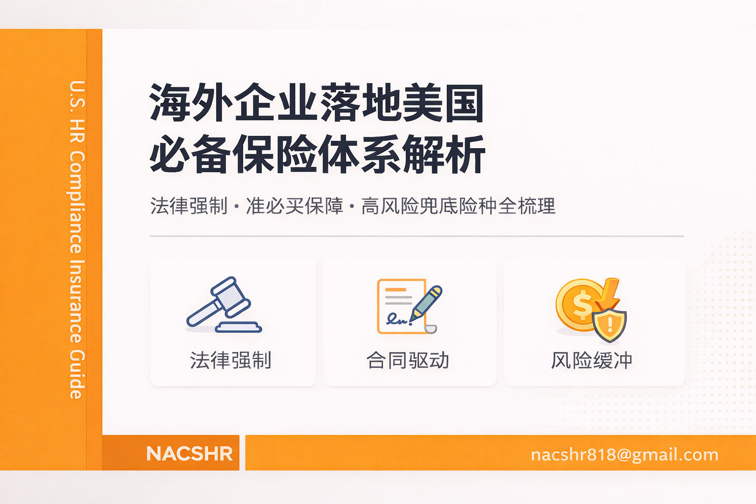 如果您正在美国设立公司或扩大团队,NACSHR团队为你提供免费风险梳理与询价服务,协助评估 Workers’ Compensation、员工健康保险、General Liability、Business Owner’s Policy、EPLI、Cyber 等核心保障是否存在缺口,并提供市场报价对比与结构建议。