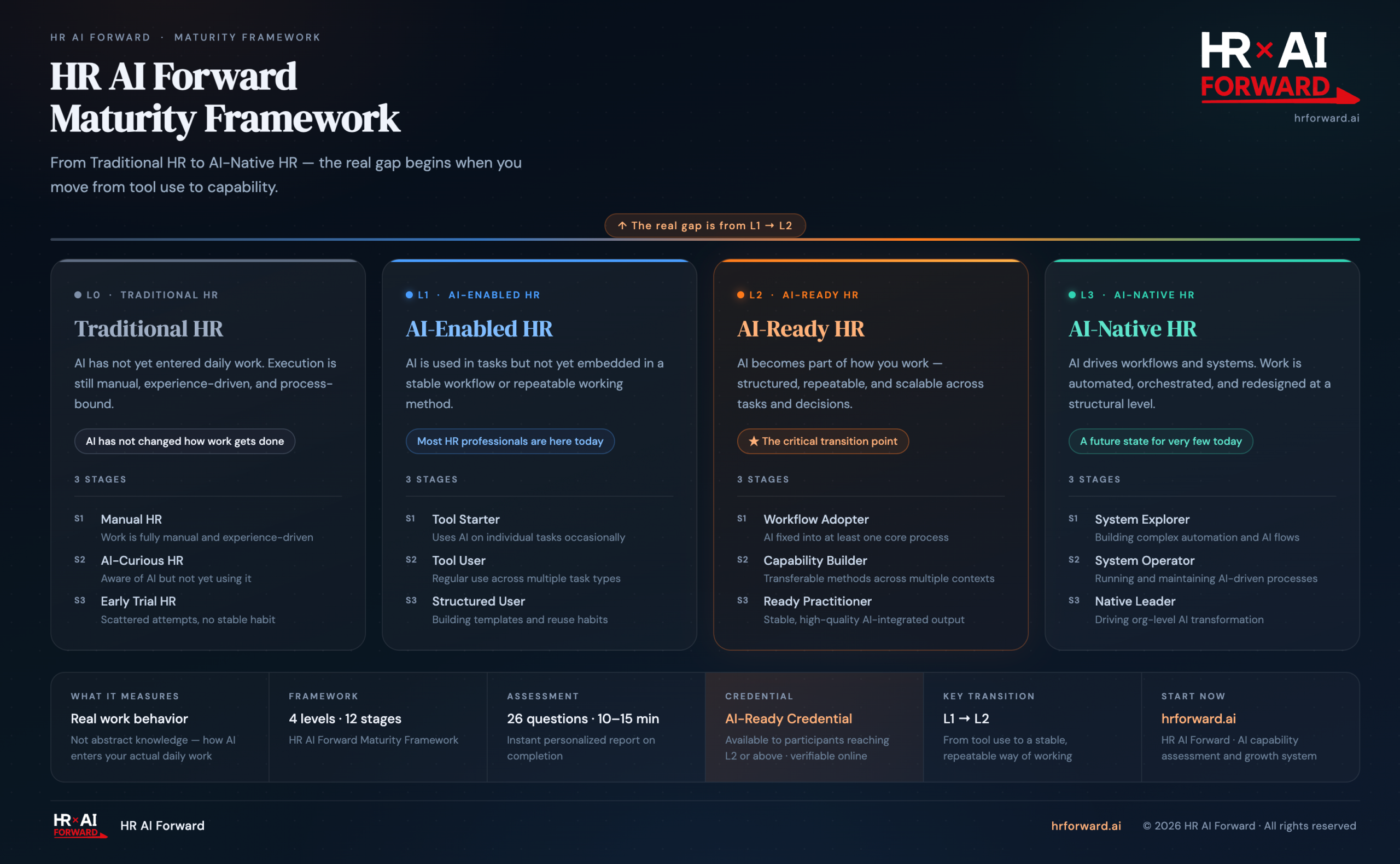 没有参照系,就没有清晰的成长路径。这是HR AI Forward Maturity Framework 存在的原因——不是为了给人贴标签,而是为了让能力的发展变得可见、可判断、可推进。
