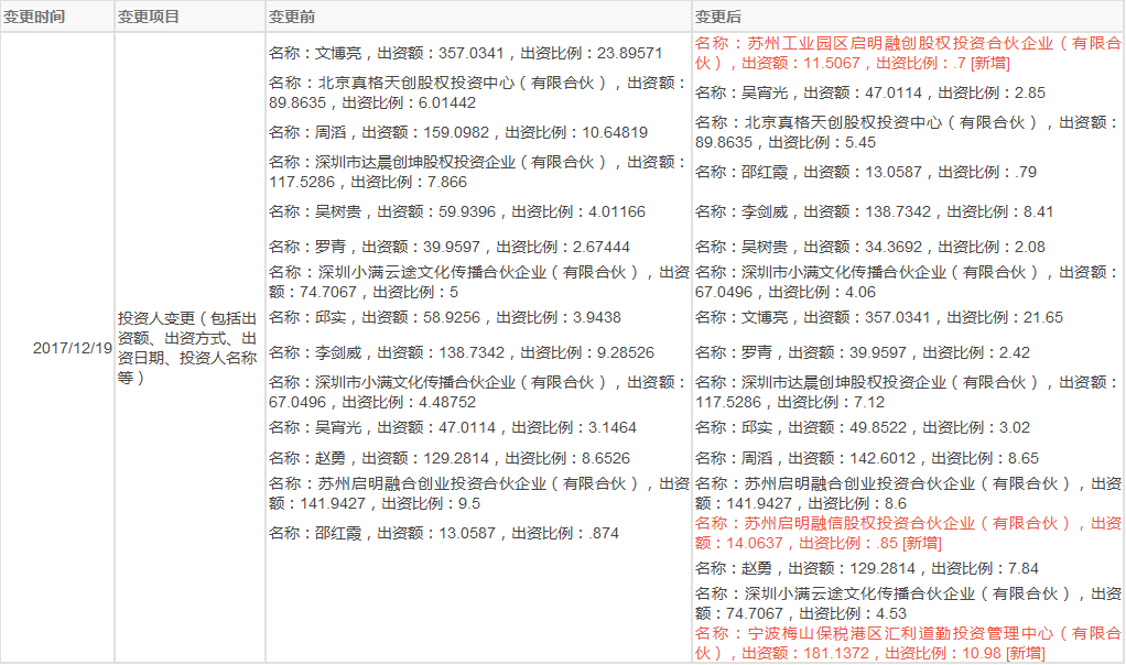 2017年12月19日,深圳市小满科技有限公司完成工商变更,公司注册资本由1494.134人民币增加至1649.7008人民币,并新增3个企业股东——宁波梅山保税港区汇利道勤投资管理中心(有限合伙)、苏州工业园区启明融创股权投资合伙企业(有限合伙)以及苏州启明融信股权投资合伙企业(有限合伙)。详细信息如下: