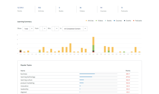 While Degreed may have initially served as a kind of hub or aggregation point for educational content initially — or at least, that's what people thought it was, McCarthy said — all that information coming in has helped it create a robust data set that it can use going forward to further help employees figure out what skills they need to learn, or even skills they didn't realize they want to learn. When an employee comes in the door for the first time, the hope is that Degreed will have enough information for what's inside the company and what the employee is interested in to gauge right away what they might want to learn.