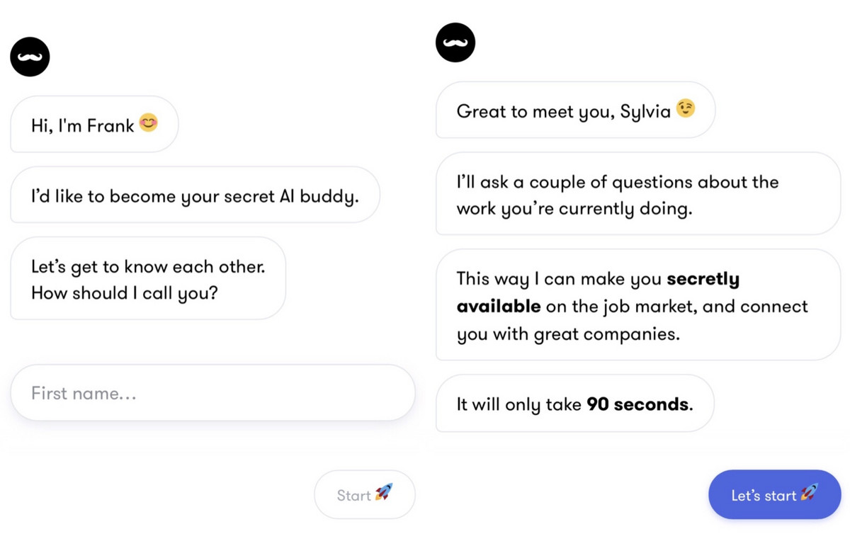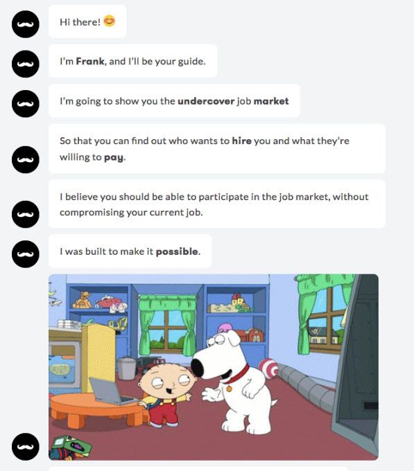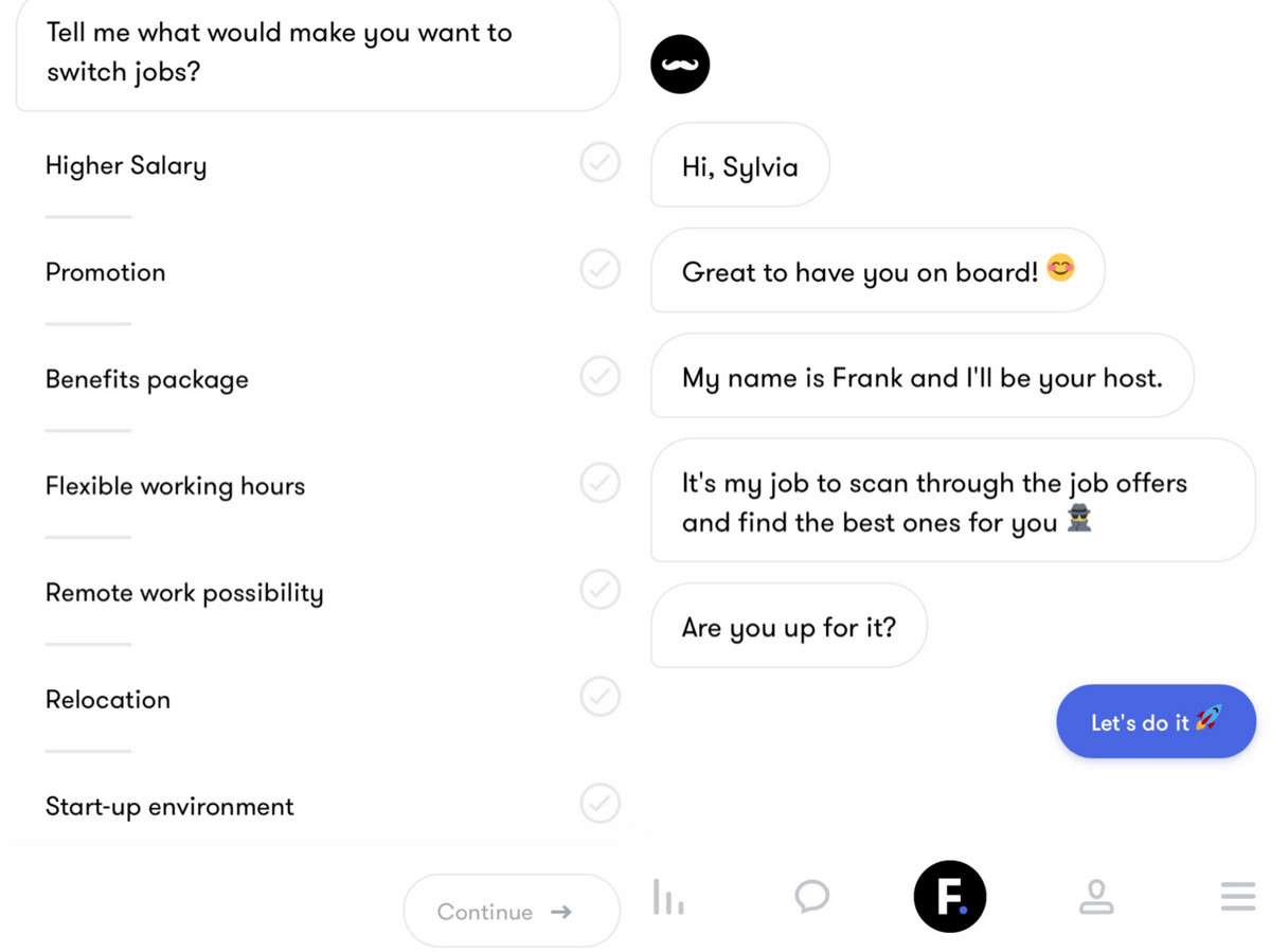 下载该app的用户首先要和Frank进行一次快速的“入职谈话”—— 从设定好的各种选项中选择他们拥有的技能、经验、为何要换工作、目前职位、薪水等等,省去自己写简历、填表格的烦恼。并且,用户不需要提供任何可以识别个人身份的信息,仅通过自身能力去匹配潜在的工作机会。