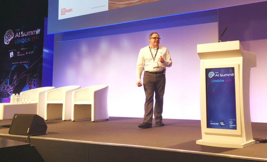 上图:UiPath首席机器人办公室Boris Krumrey在伦敦AI论坛上发表演讲(2019年)