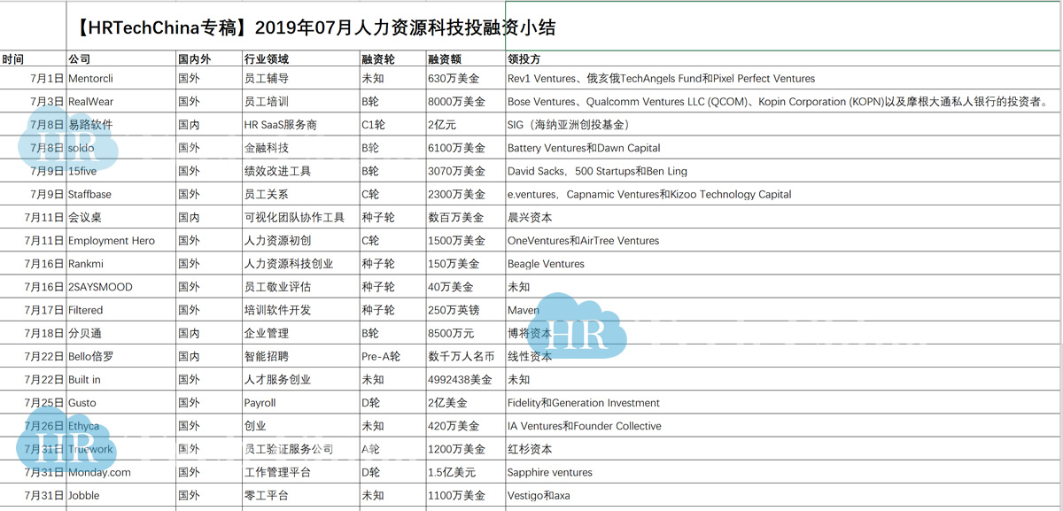2019年7月,HRTechChina共收录了19家人力资源科技行业投融资信息。投融资信息分别为:国内4家,国外15家。同时,编辑又把人力资源科技行业再进行领域细分,本月收录的细分领域涉及:招聘、零工经济、人工智能、工作管理、新创、员工验证、员工辅导、GDPR、入职管理、数字化人才管理、绩效管理、SaaS等几大类。本月B轮为投资热点,共发生4起融资事件,总计获得约2.5亿美元融资。以下为详细情况。