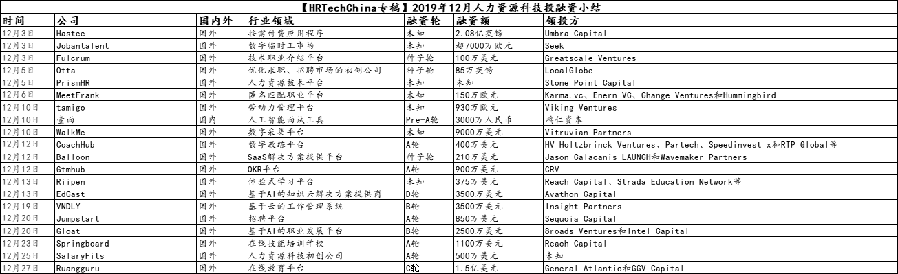 2019年12月人力资源科技投融资表供参考⇓