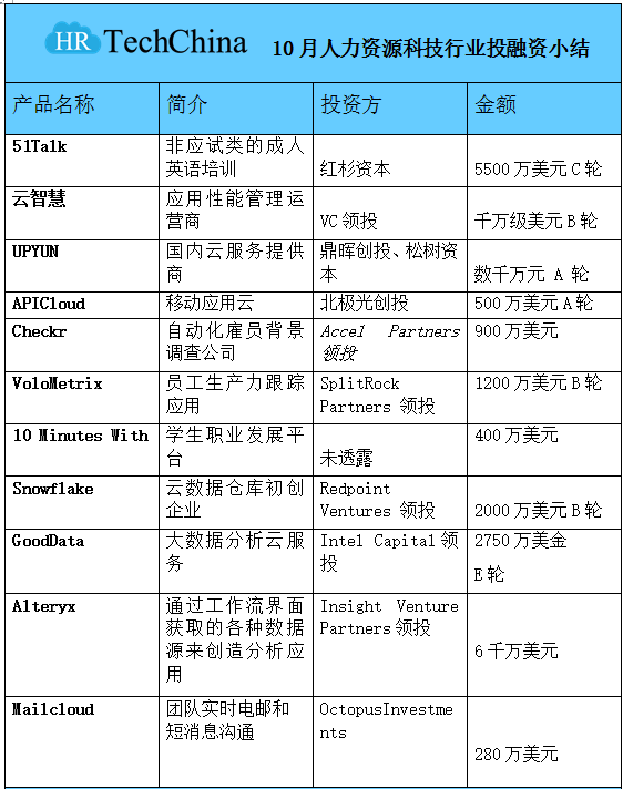 从上图表中,你是否发现某个词重复出现,是的,那就是“云”。在10月份的人力资源科技行业的融资小结中,我们发现云,云服务的产品受到了格外的关注,尤其是本月国内的这几个云产品:云智慧、UPYUN、APICloud。