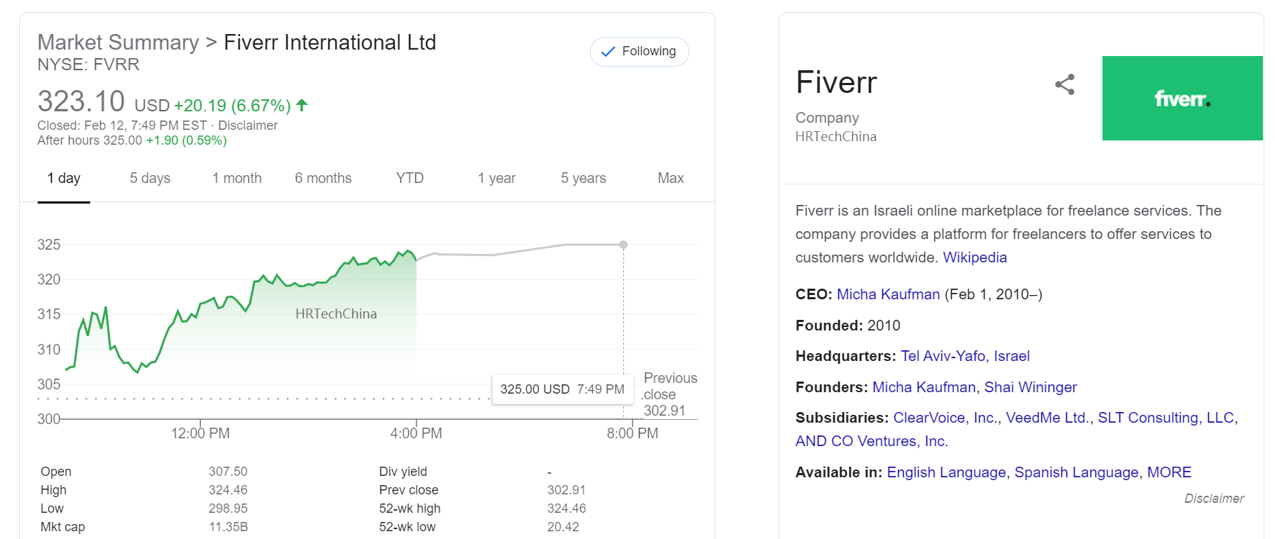 附录:任务分包零工平台Fiverr国际在2021年2月12日收盘后股价创历史新高323.10美元美股,市值达到了113.46亿! 要知道去年2020年涨幅达到700%以上!今年年初至今也已经涨幅达到65.61%。领涨全球人力资源还有Fiverr国际的竞争对手Upwork,市值也创新高69.3亿美元,年初至今涨幅也达到了64.46%。