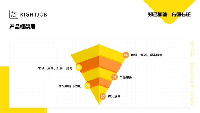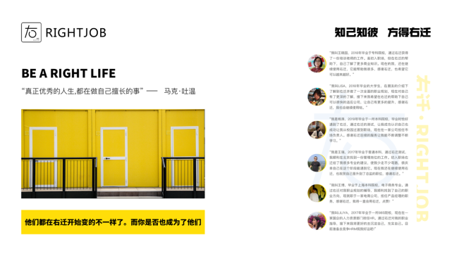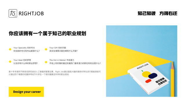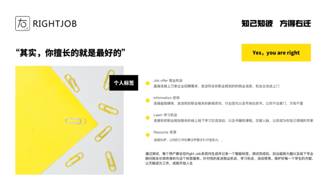 知己。右迁的智能测试通过不同维度的测验快速的让大学生了解自己,找到属于自己的职业发展标签,平台针对不同的标签迅速且永久的提供多维度的赋能:学习机会、学习材料、职位机会、资讯等多种赋能模块让每个学生的“理想”可以垂直生长,不断的生长和壮大。