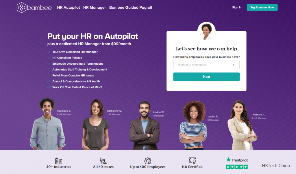 从每月99美元开始,Bambee的客户可以得到HR Autopilot的组合,它可以自动处理常见但重要的HR实践,如员工入职、政策签署、培训和双向反馈;还有一位专门的人力资源经理,在更复杂的人力资源问题上提供指导和辅导,如人力资源战略、员工辅导、冲突解决和解雇。雇主还可以从Guided Payroll™中获益,这是有史以来第一个内置人力资源指导的薪资产品。Bambee的指导性薪资产品在第一年对雇员少于20人的公司和初创企业是免费的,这意味着雇佣了3000多万美国工人的400多万美国企业现在可以轻松获得指导性薪资。对于更成熟的小公司,Bambee的薪资产品的价格是最大的可负担性,比市场平均价格低70%。