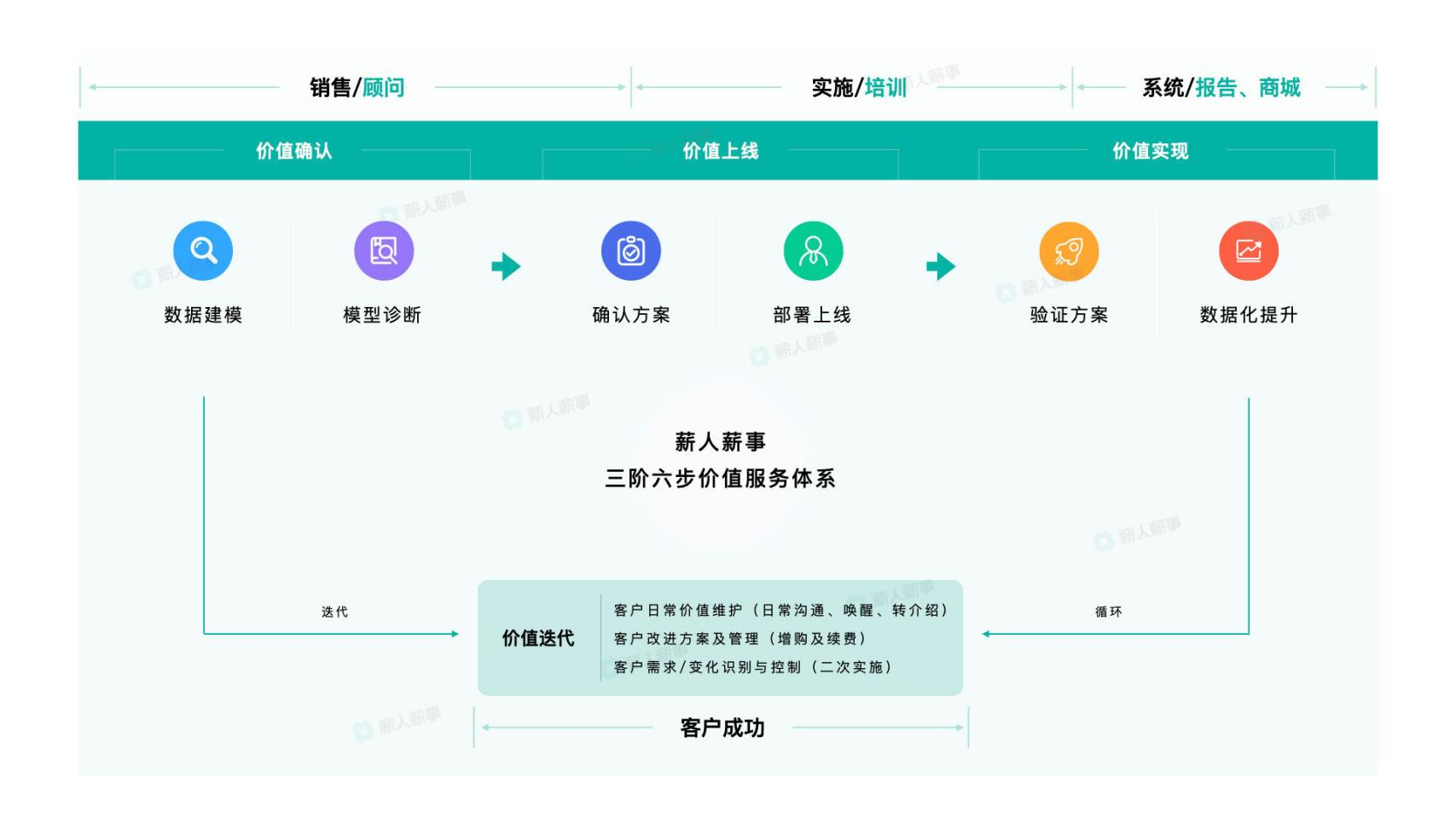 得益于与众不同的数据基座,薪人薪事打造出“三阶六步服务体系”和“动态样板间”。当客户接入后,就为其建立数据模型,而后进行模型诊断-确认方案-部署上线-验证方案-数据反馈,然后再循环优化,反复验证。当需要增购新模块时,直接导入少量历史数据即可。