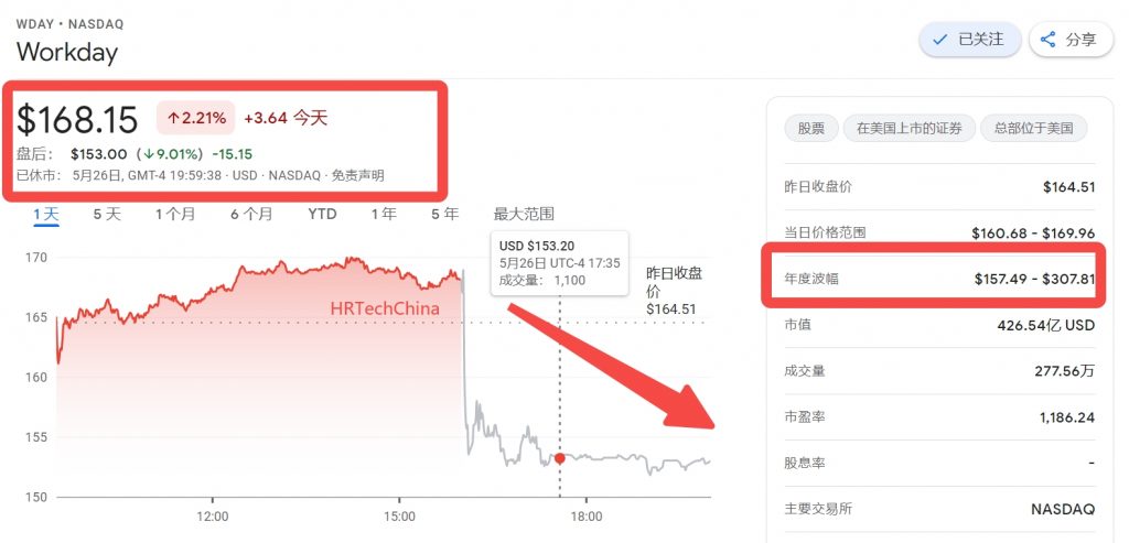 Workday财报发布后,低于市场预期。盘后大跌9%,每股153美元,创1年来历史新低。