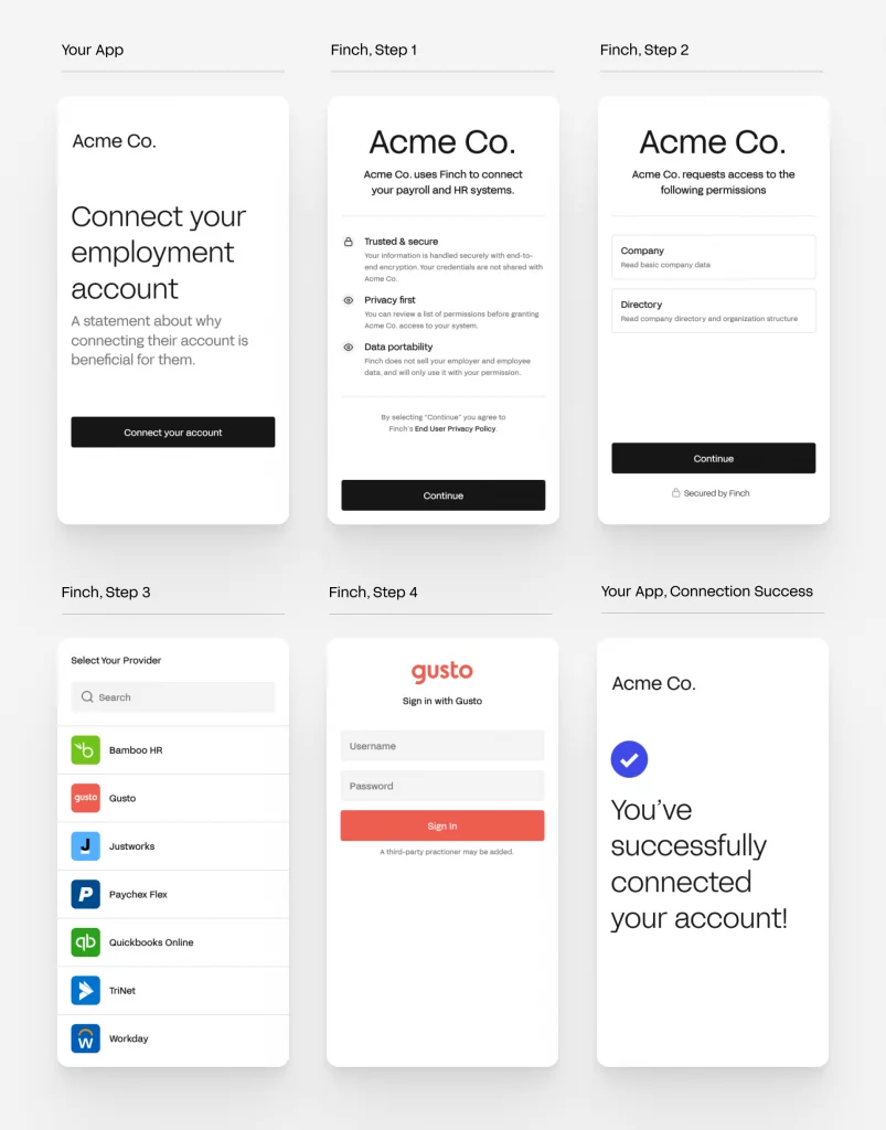 "假设你已经使用Finch来促进你的就业系统和一个应用程序之间的连接。在这种情况下,Finch将与该应用分享就业数据。Finch与你的应用程序共享的数据类型取决于通过授权程序授予的权限和就业系统提供的信息,"Zhang说,"未经同意,我们不会与任何应用程序分享数据。我们不出售或出租所收集的个人信息。"