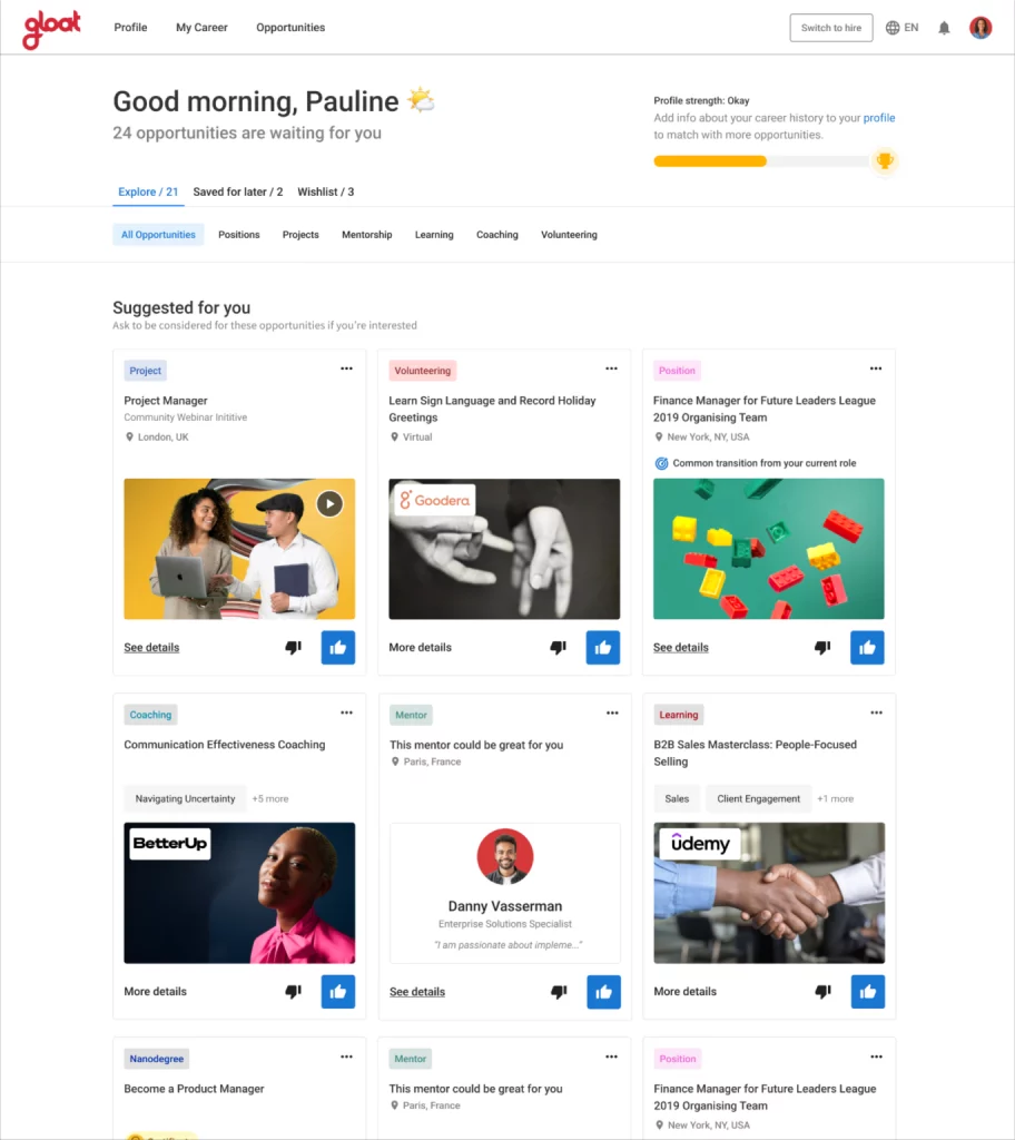 Gloat使用人工智能系统来映射技能、角色、候选人和公司之间的关系。经过对简历、职业介绍、工作描述、学术内容、经济数据和薪酬数据的训练,该系统试图量化工作名称、工作要求和技能需求的变化方式。鉴于同样的工作头衔在不同的公司可能意味着不同的东西;Gloat的设计是为了理解这些细微差别,并自动推断不同公司、地域和行业的角色差异。