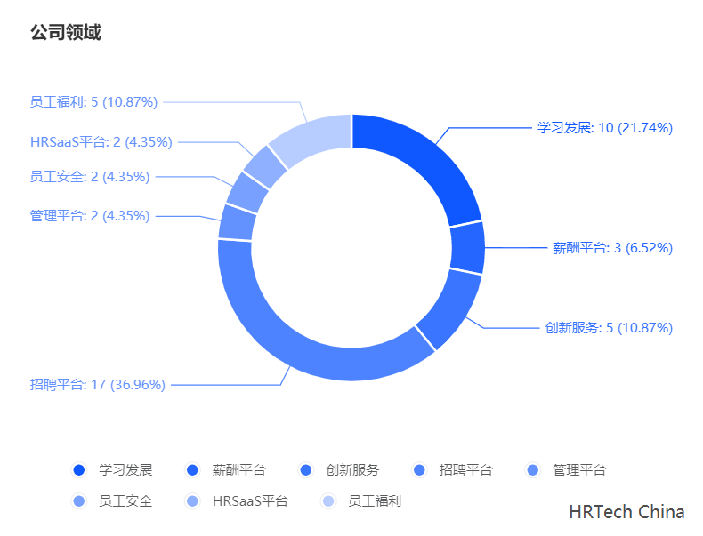 从公司领域来看,本月投资领域重心明显,较为突出的板块依旧为招聘平台,共17起;其次是学习发展平台,共涉及10家公司。