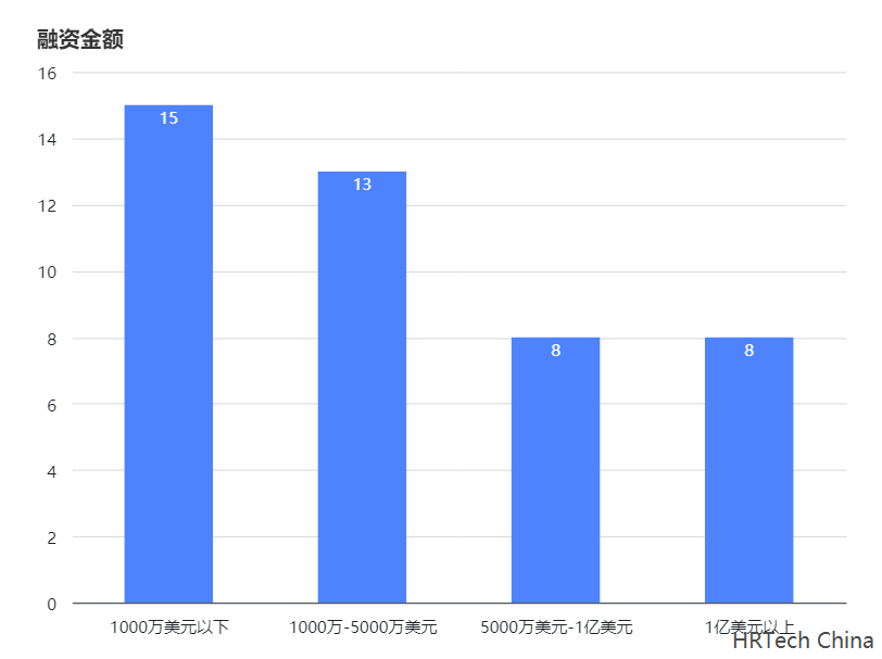 如图所示,15家公司的融资金额在1000万美元以下,8家公司融资金额超过1亿美元。