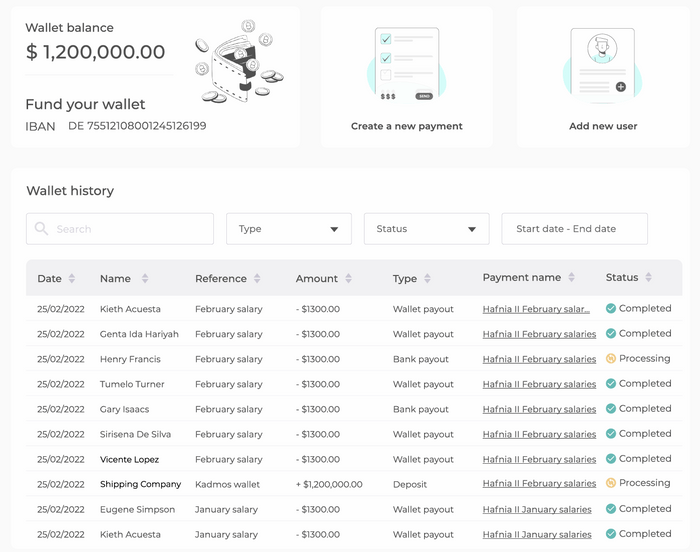 Kadmos为航运公司开发了一个安全的工资支付平台,使他们能够有效地向其船员支付薪资。Kadmos提供与Kadmos网络应用程序的无缝集成,公司可以通过API-连接到各种船员软件自动添加他们的员工。