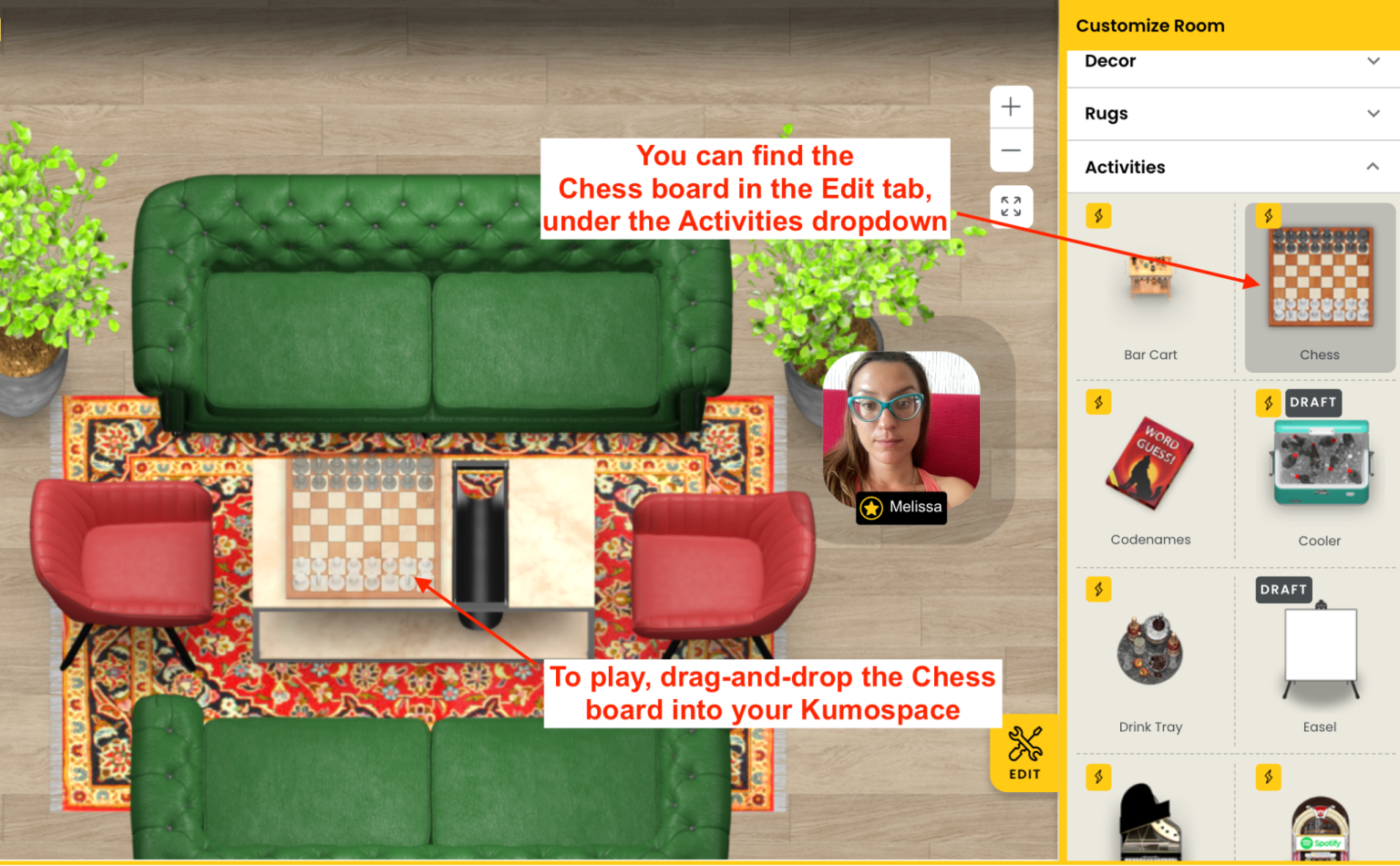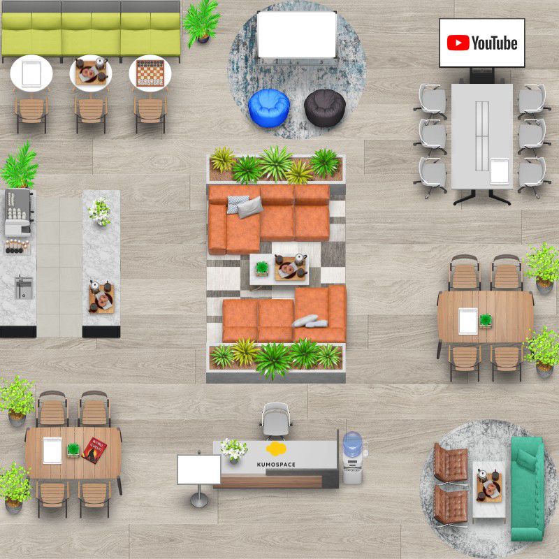 Kumospace的用户可以在虚拟空间内移动,加入私人房间,并具有状态信息和同步屏幕共享等功能。他们的化身的位置--例如在一个会议室--是为了表明他们是否不舒服,是否可以进行聊天等等。