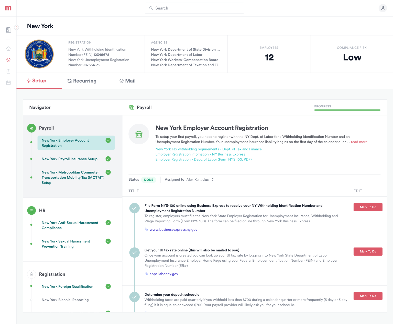 Mosey的解决方案是与薪资供应商和政府机构整合,定期 "重新计算"纳税义务。人力资源工作者可以使用该平台自动开设雇主和税务账户--Mosey显示了每个地方在工资、注册和税收方面的要求。它还会在新的要求被添加和最后期限临近时发出警报和提醒。