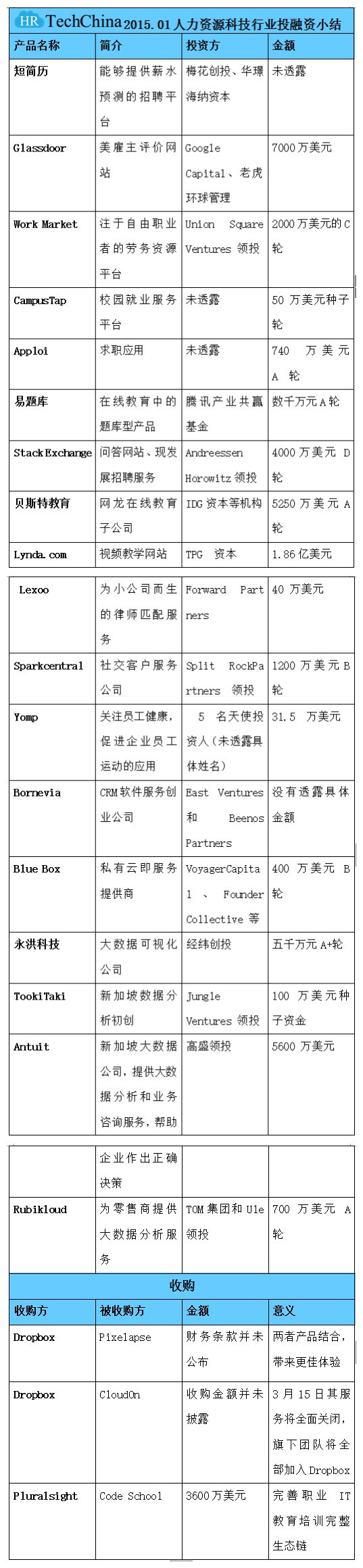 2015年一月,新年伊始的第一个月,就人力资源科技行业的投融资情况来说,还是比较乐观的。但从本月的整理来看,大多受到投融资的产品或公司都来自国外。