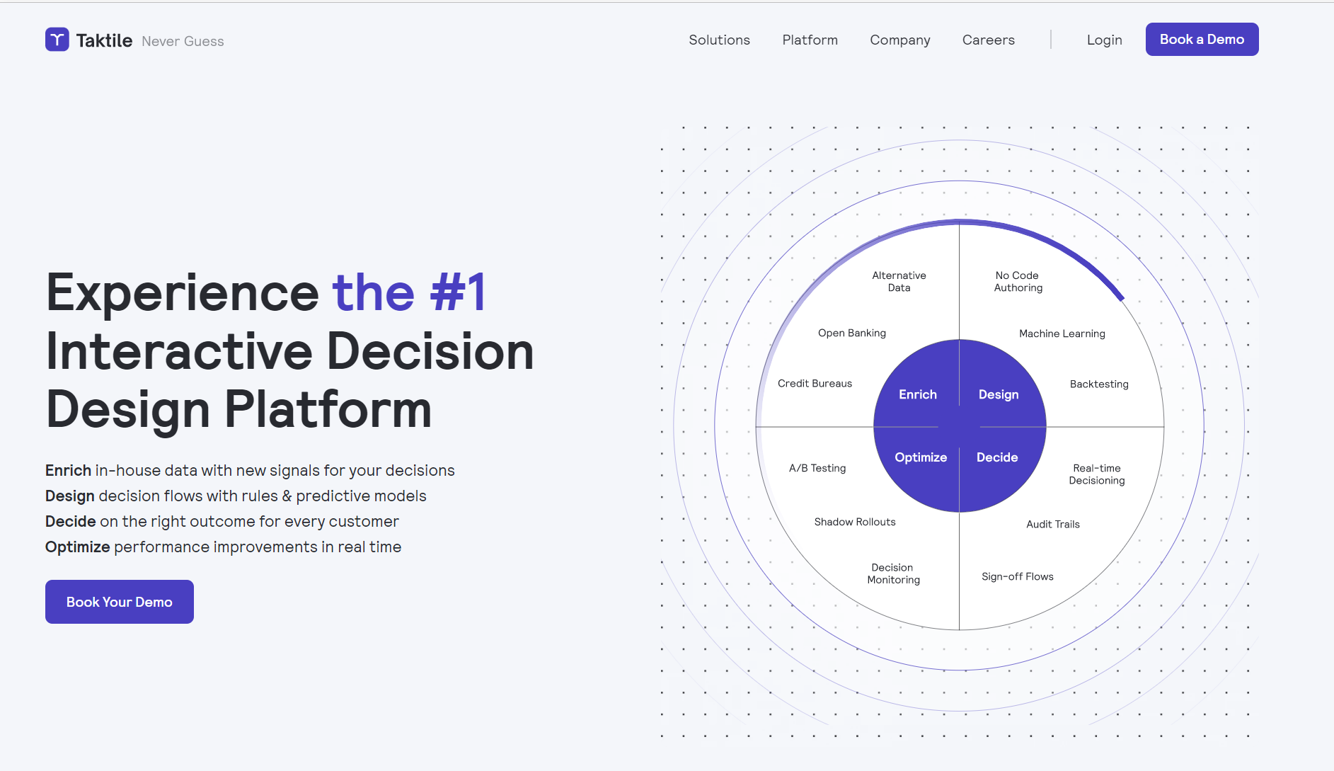 Taktile的平台的优势是能够利用新的技术丰富内部数据,为用户的决策提供依据 以及使用规则和预测模型。同时还能够设计决策流程,为每个客户确定正确的策略,进行实时性能优化改进。