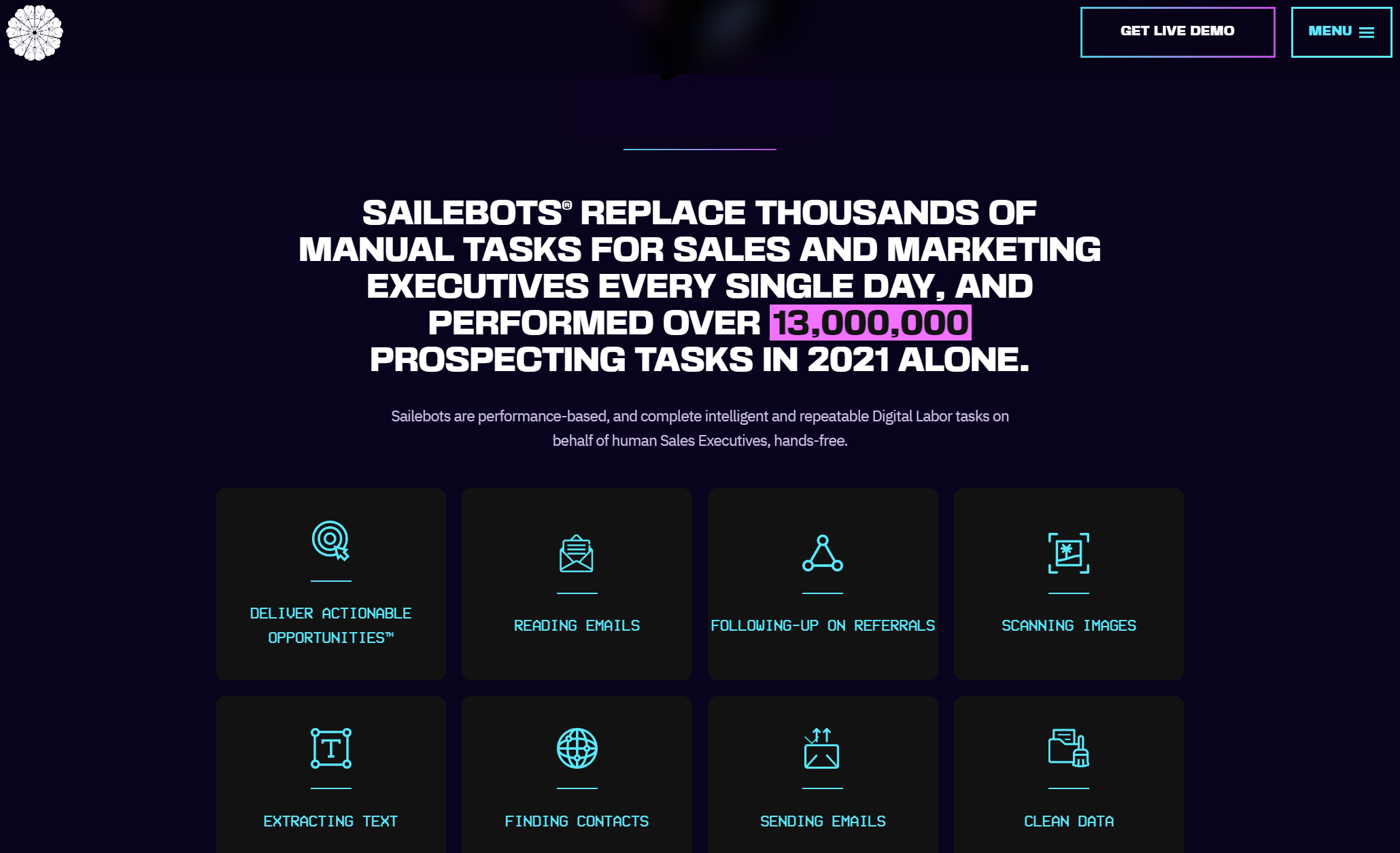 Sailebots 基于绩效,代表人类销售主管完成智能且可重复的数字劳动任务。比如阅读电子邮件、提取文本、发送电子邮件、查找联系人、跟进转介等。
