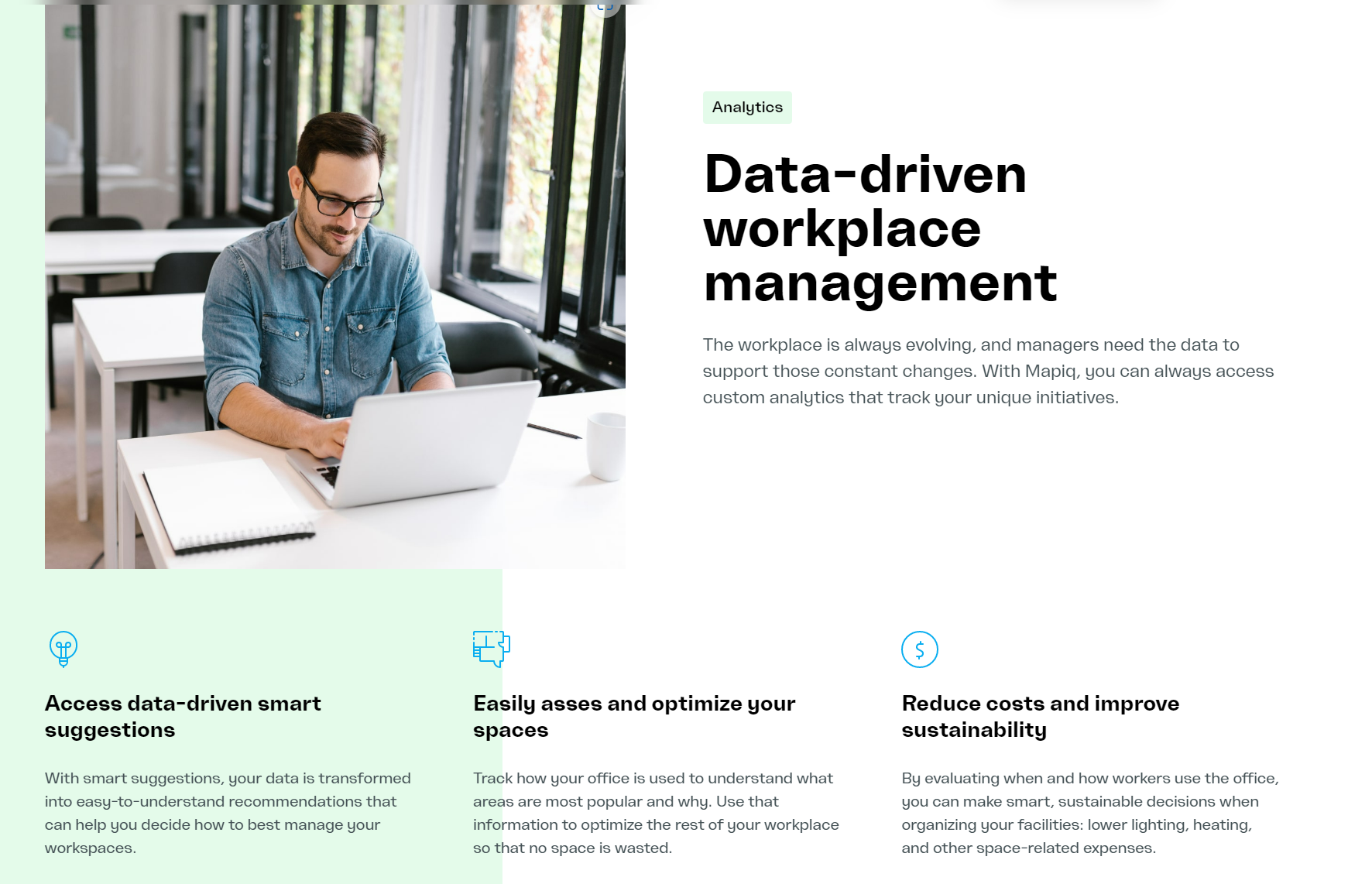 Mapiq成立于2013年,是一款日常软件,可提供智能的自定义建议,以简化工作日程,使组织能够管理和改进其设施。其目标是帮助用户削减房地产成本和支持可持续发展目标。大流行在全球范围内加速了混合工作。