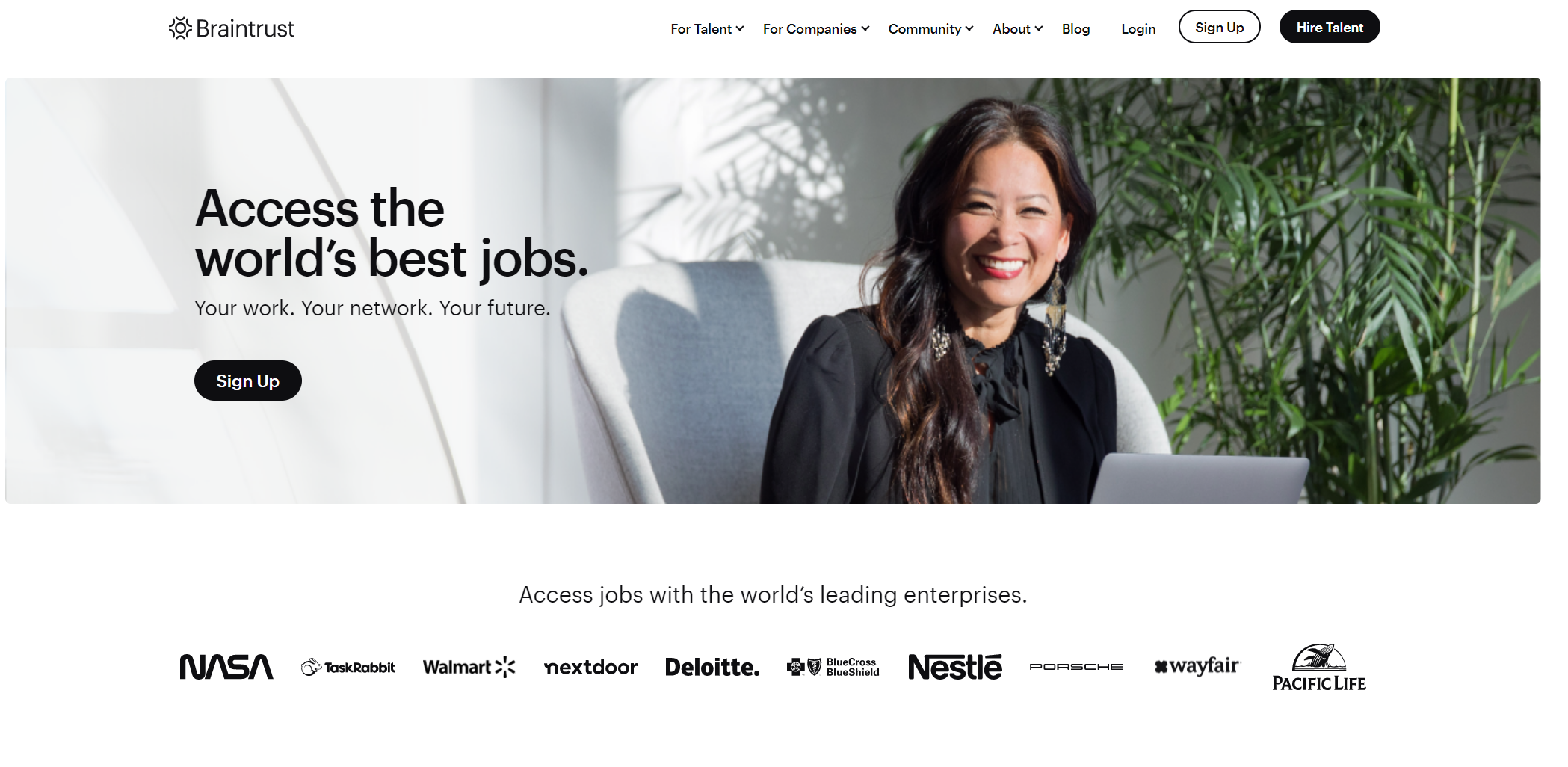 Braintrust 把握了蓬勃发展的零工经济的趋势,通过平台的形式将世界各地的知识型自由职业者与 Nike、德勤、雀巢、NASA 等顶级公司进行匹配。Braintrust 的收益来自分成,一旦实现成功招聘,企业需要向 Braintrust 支付劳动合同金额的 10% 作为服务费,这一费率远低于 Upwork、Fiveer 、Toptal 等平台 30%~40% 的抽佣水平。
