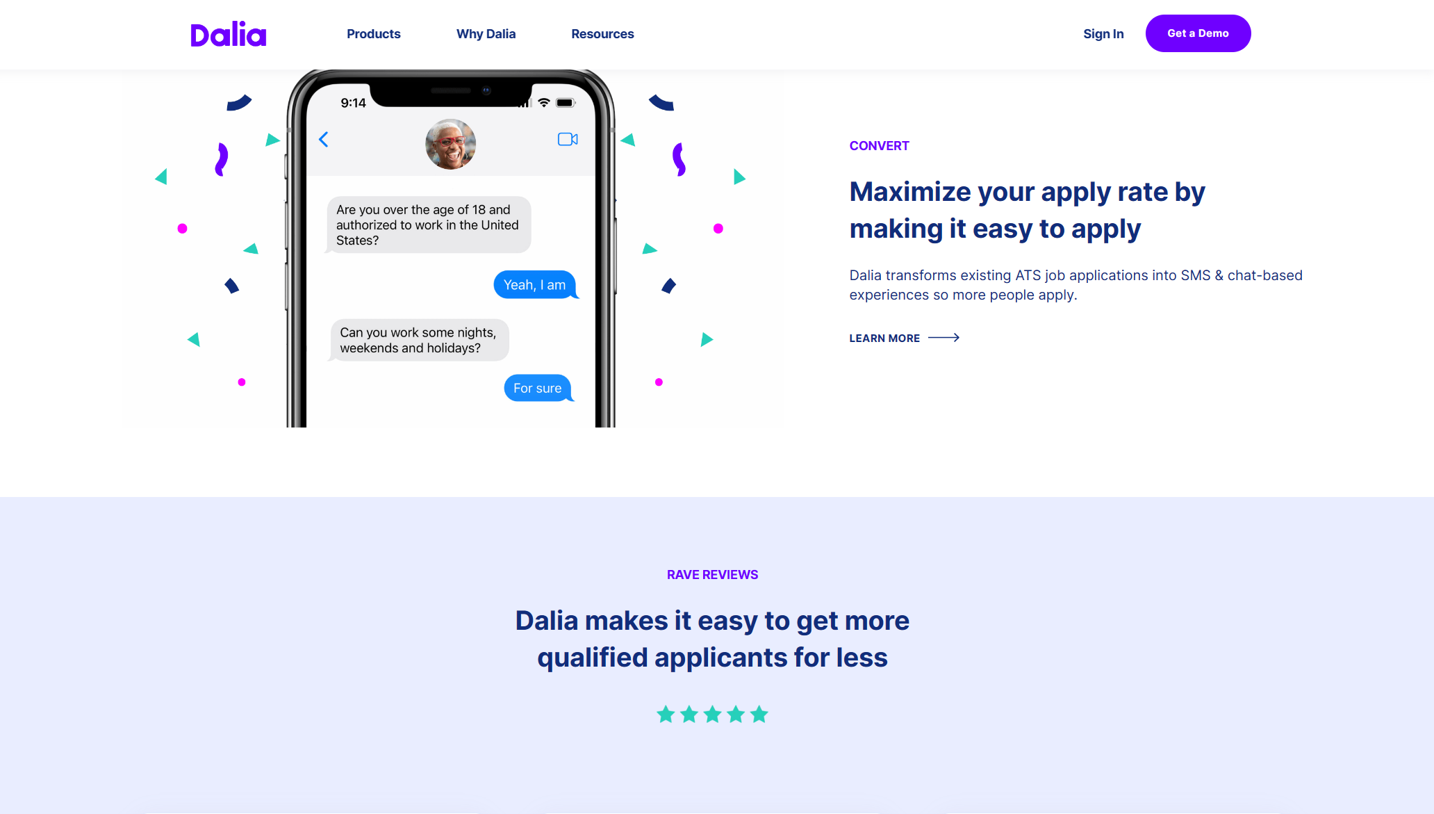 Dalia为雇主提供了一个招聘营销自动化平台,该平台可以转换求职者流量。借助 Dalia,雇主可以捕获访问其职业网站但不申请的求职者,并通过电子邮件和文本的方式引导他们关注相关招聘信息,以最大限度地提高申请率,为人才招聘团队提供更多合格的候选人并降低他们的招聘广告支出。该系统是完全自动化的,可与现有的ATS和CRM平台配合使用,并且可以在短短几天内实施。