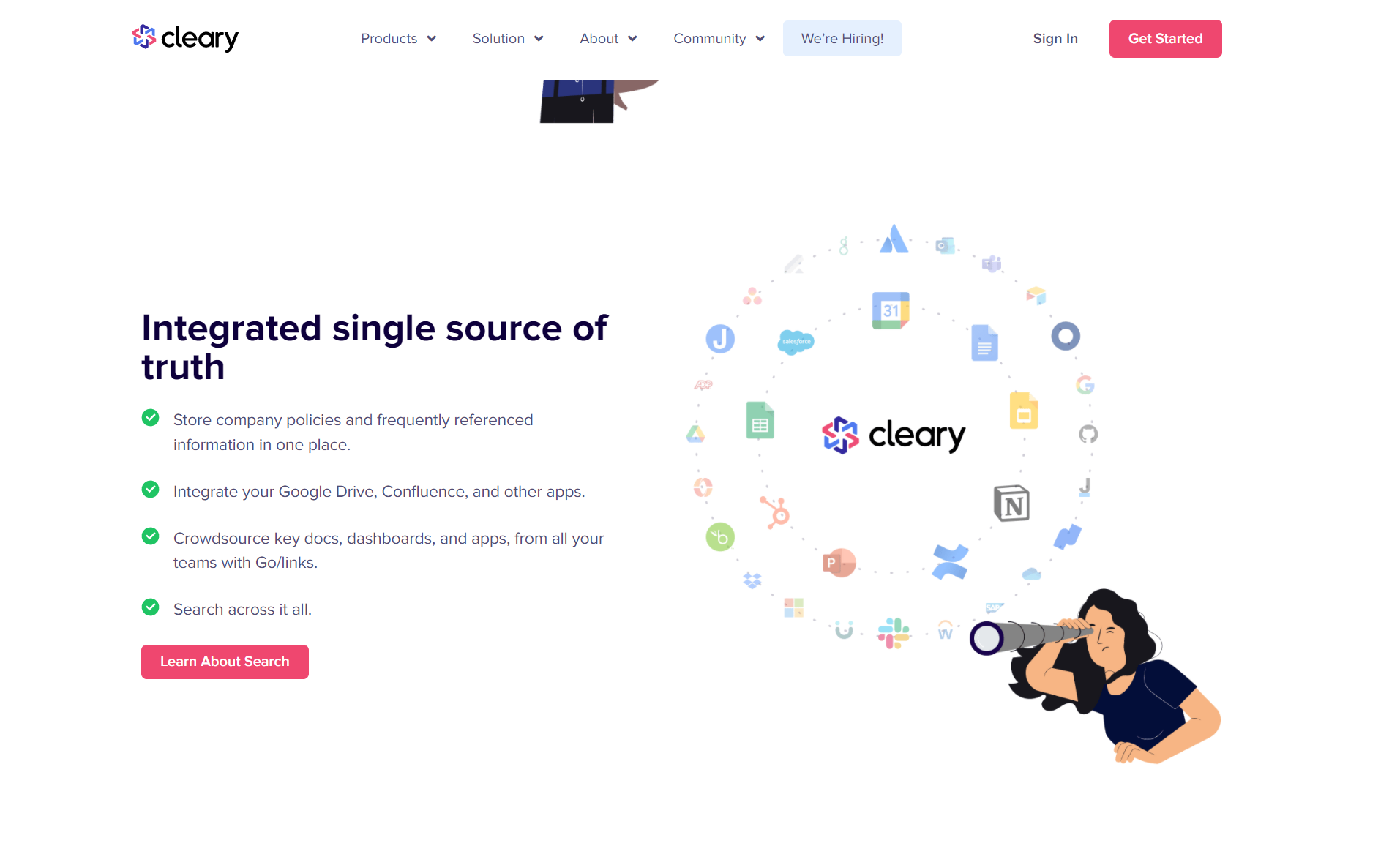 Cleary 的具体功能包括公司新闻更新、组织结构图、跨职能团队管理、内部维基、内部搜索等。Cleary 还支持可定制的员工旅程,用于入职、部门调动等,帮助人员团队节省时间并为员工提供有凝聚力的体验。