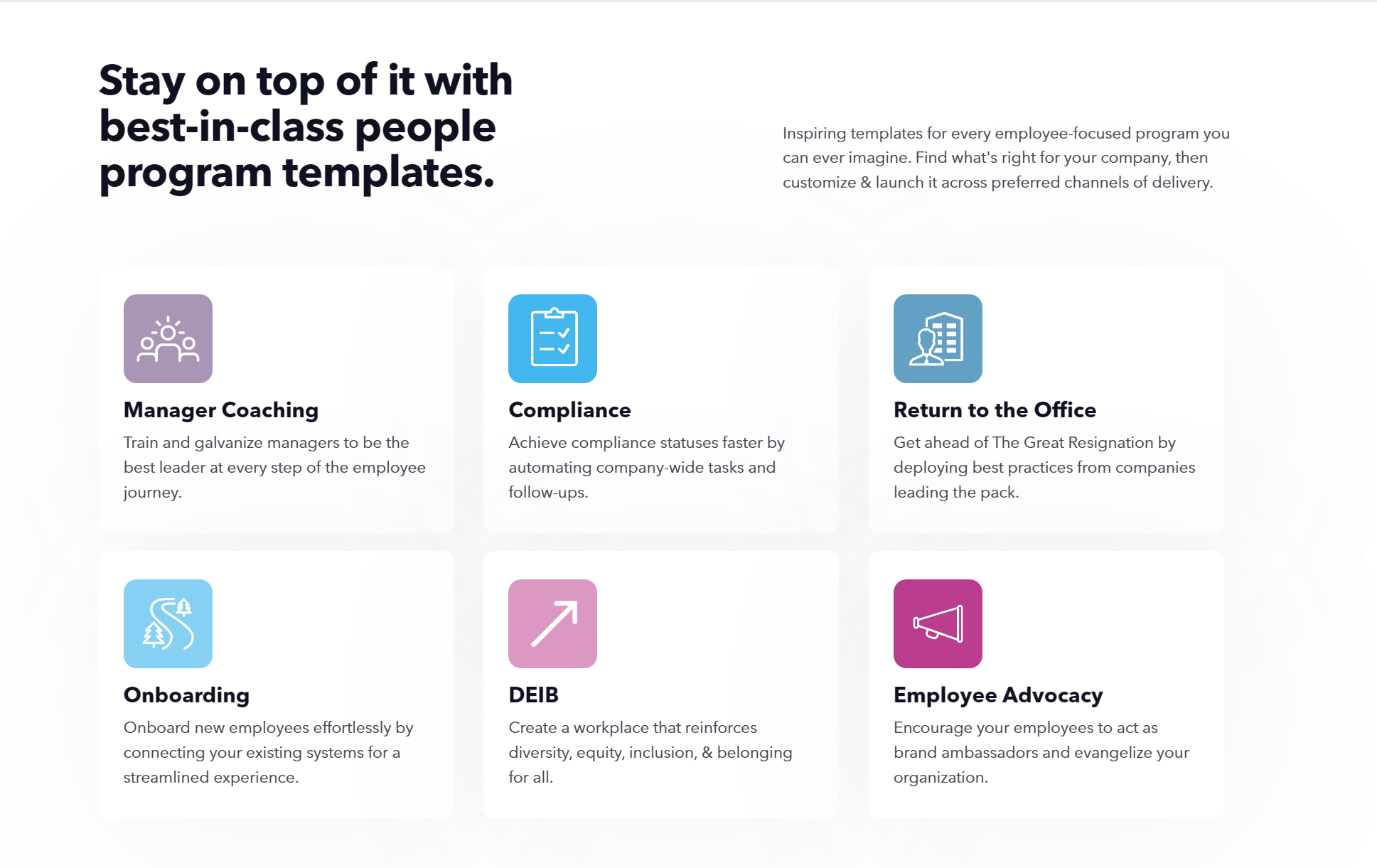 ChangeEngine的优势在于让组织能顾轻松地了解整个员工旅程。平台可为团队配备一流的人员计划模板,这些模板已被证明可以提高员工敬业度。根据公司目标获取建议,并在几分钟内找到适合公司的产品,然后通过首选的交付渠道进行定制和启动。