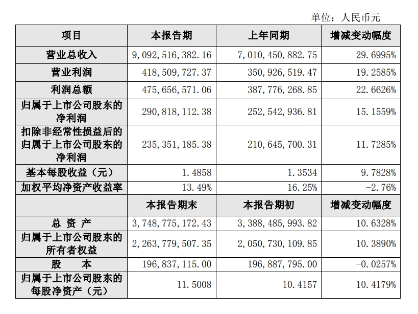 利润总额47,565.66万元,同比增长22.6626%;归属于上市公司股东的净利润29,081.81万元,同比增长15.1559%。
