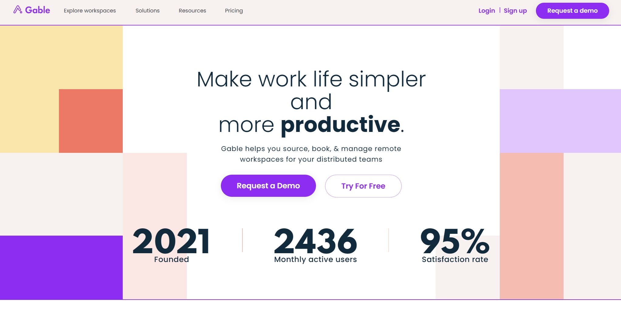 Gable于2020年推出,正值大流行开始迫使公司转向远程工作,并从根本上改变了团队合作的方式和地点。在Gable的门户网站上,员工可以看到他们的同事当天在哪里工作,并根据工作安排预订办公桌,同时公司可以管理预算并监测员工满意度。