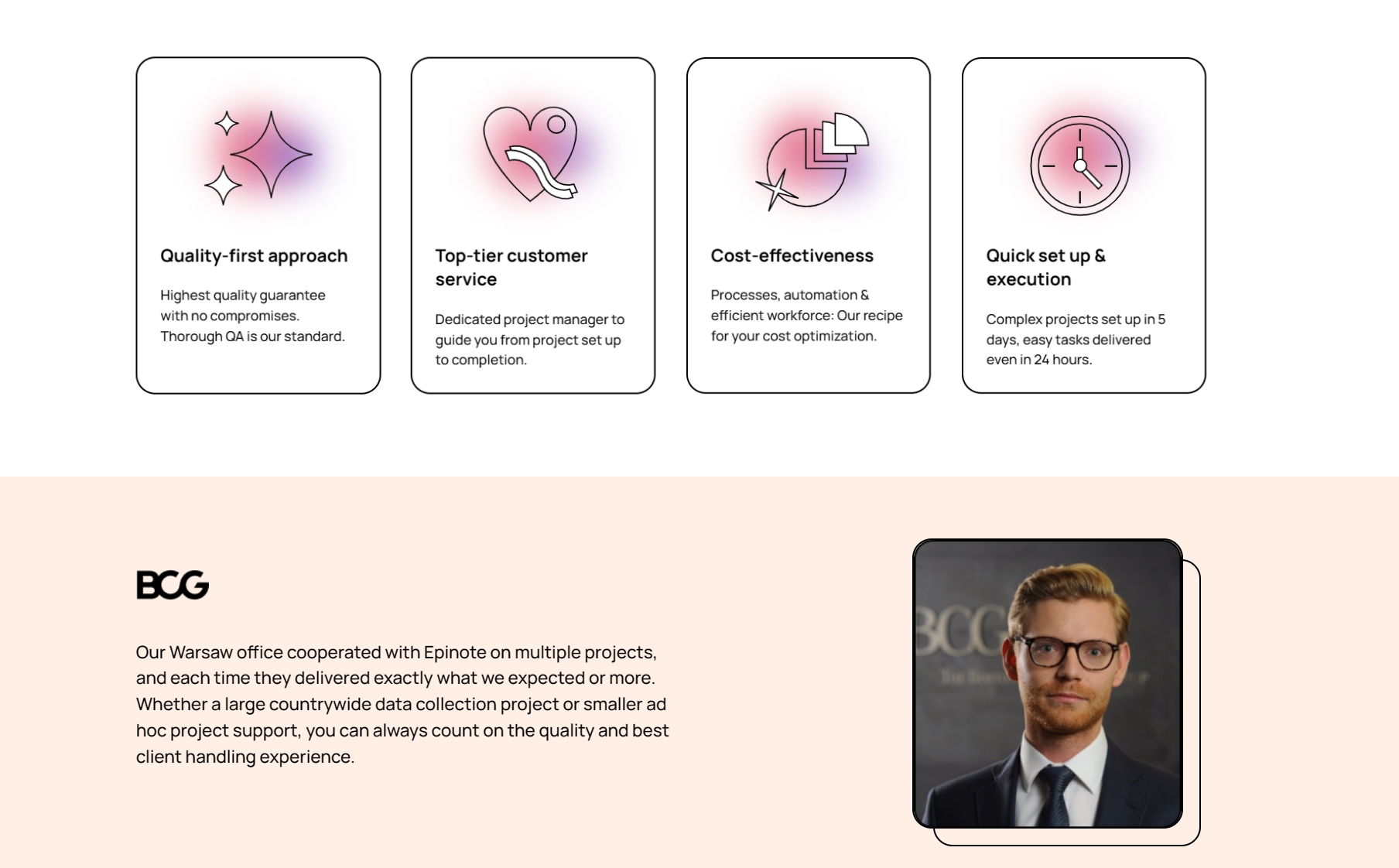 Epinote提供了两全其美的方法。我们使用软件来提高我们的生产力,并提供一个易于部署的员工团队,我们已经证明这种模式是有效的。在投资者的支持下,我们可以帮助组织提高效率,为全球更多的公司提供服务"。