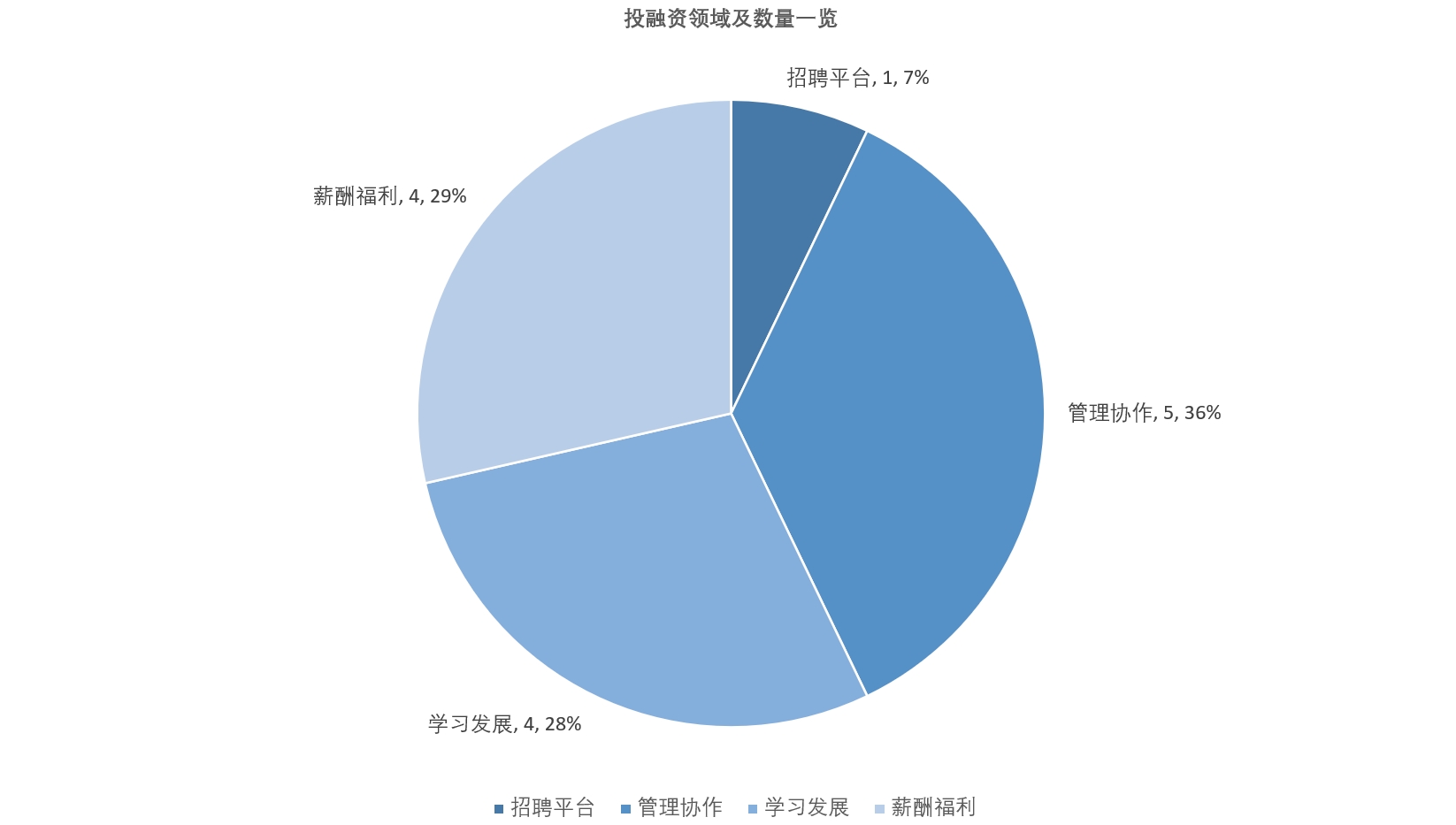 在本月HRTech投融资报道细分领域方面,主要涉及:招聘平台、管理平台、学习发展、员工体验、薪酬福利、工作场所协作平台等几大类。投资领域重心板块以薪酬福利(4起)、学习发展(4起)、员工管理(4起)为主。