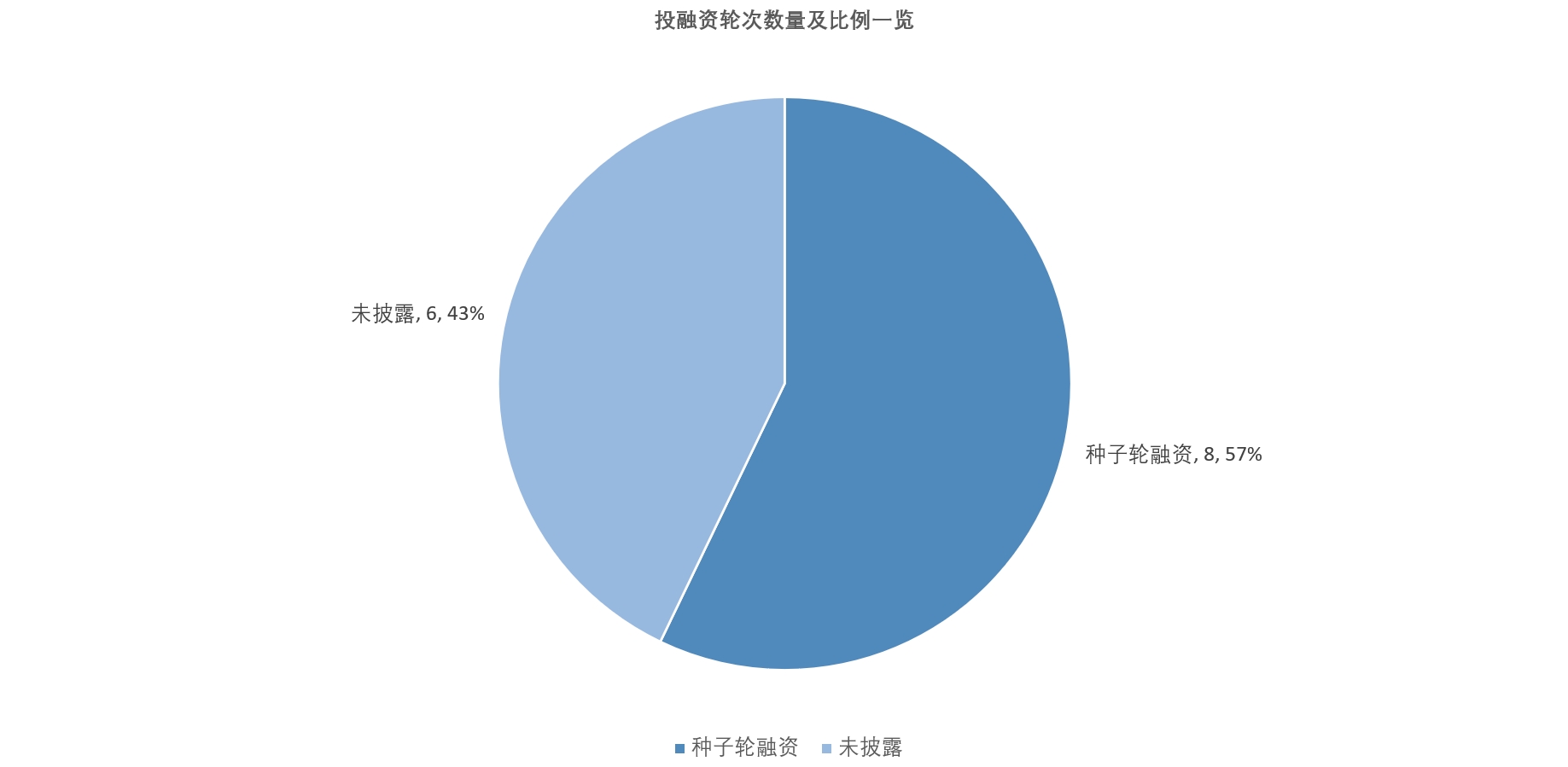 在融资轮次上:本月融资轮次以种子轮融资为主。其他轮次的投融资均未报道。此外,本月未披露融资轮次的报道共有6起。