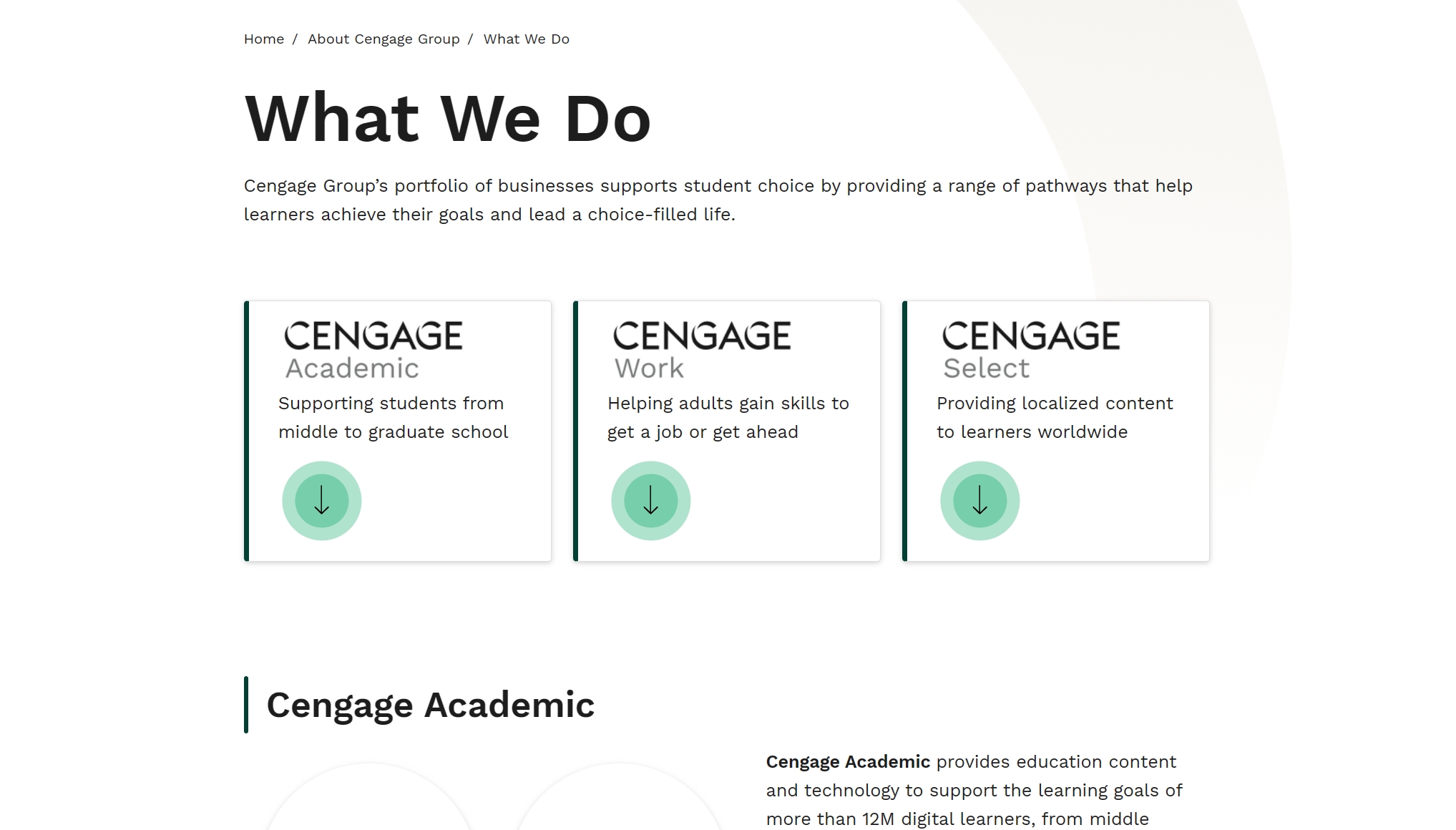 Cengage Group是一家全球性的教育科技公司,为从中学到研究生和技能教育的所有学生提供优质的内容和技术支持。它的三个业务部门:Cengage Academic、Cengage Work和Cengage Select,每年帮助超过125个国家和地区的数百万学生实现他们的教育和职业目标。