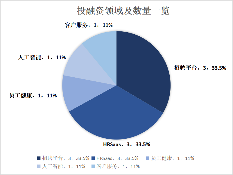在本月HRTech投融资报道细分领域方面,主要涉及:招聘平台(3起)、HRSaas(3起)、员工健康(1起)、人工智能(1起)、客户服务(1起)。投资领域重心板块以招聘平台(3起)和HRSaas(3起)为主。