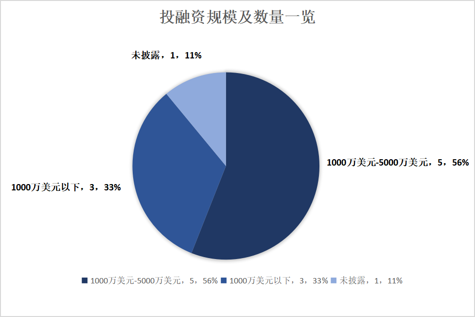 在融资规模上:除去未披露金额的投融资项目,本月的融资规模区间主要集中在1000万美元-5000万美元(共计5起),且融资规模均没有超过1亿美元。