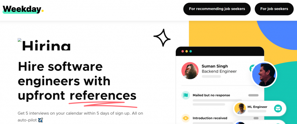 Weekday 由Amit Singh、Anubav Malik和Chetan Dalal于 2021 年创立,是一家由 Y Combinator 支持的初创公司,帮助公司雇用由其他软件工程师担保的工程师。