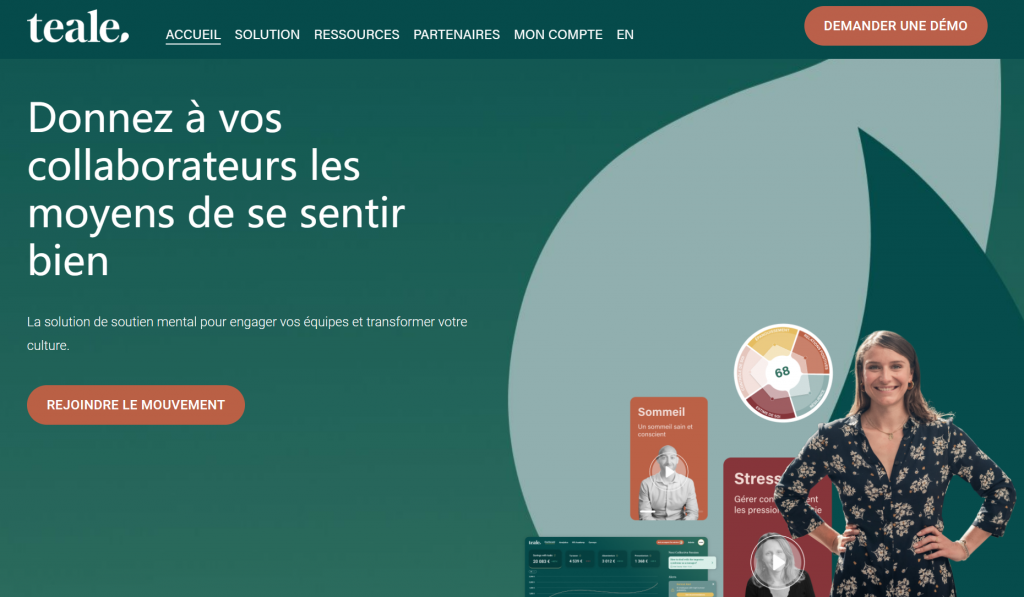 Teale 公司成立于 2021 年,由 Julia Néel Biz、Geoffroy Verzat、Nicolas Merlaud 和 Gilles Rasigade 创立,是一家专门为员工提供整体心理健康平台的公司。公司利用技术和认知与行为科学为员工和组织服务,通过个人辅导为员工提供参与和支持,通过集体支持转变文化和预防风险。成立 30 个月后,teale 已拥有一支由 25 名员工组成的团队,并得到 100 名专业人员的支持。他们为 100 多家客户提供服务,其中包括赛诺菲(Sanofi)、Sncf、家乐福(Carrefour)、Bearing point、安永(EY)、卡地亚(Cartier)和 BETC。