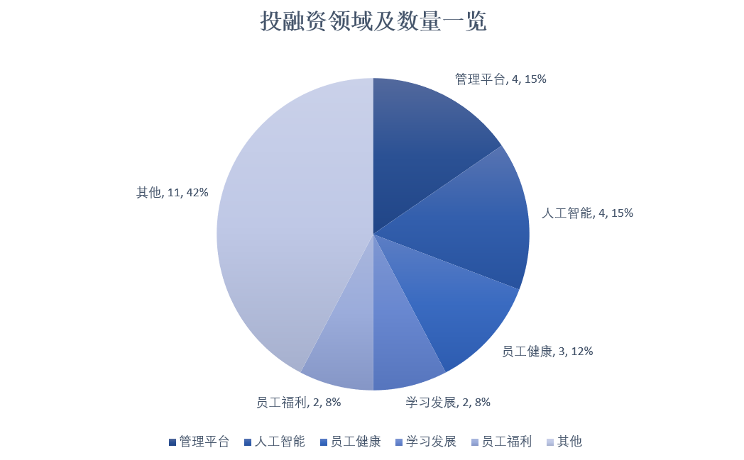 在本月HRTech投融资报道细分领域方面,主要涉及:管理平台(4起)、人工智能(4起)、员工健康(3起)、学习发展(2起)、员工福利(2起)、其他(11起)。投资领域重心板块以管理平台(4起)、人工智能(4起)、员工健康(3起)为主。