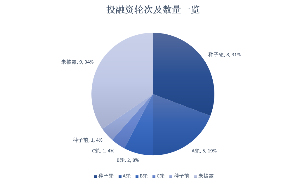 在融资轮次上:本月融资轮次以种子轮融资、A轮融资及未披露融资轮次为主。种子轮融资报道了8起,A轮融资报道了5起,未披露融资报道了9起,剩余融资轮次涉及B轮(2起)、C轮和种子前各1起。