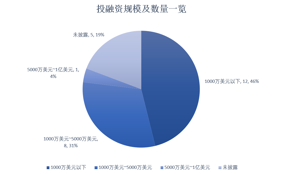 在融资规模上:本月报道的投融资项目有4起未披露金额,其余均披露了融资金额,融资金额从50万美元到6000万美元不等,极差较大。投融资报道的规模区间主要集中在1000万美元以下(12起),1000万美元至5000万美元共报道了8起,5000万美元~1亿美元报道了1起,未披露金额报道了5起。