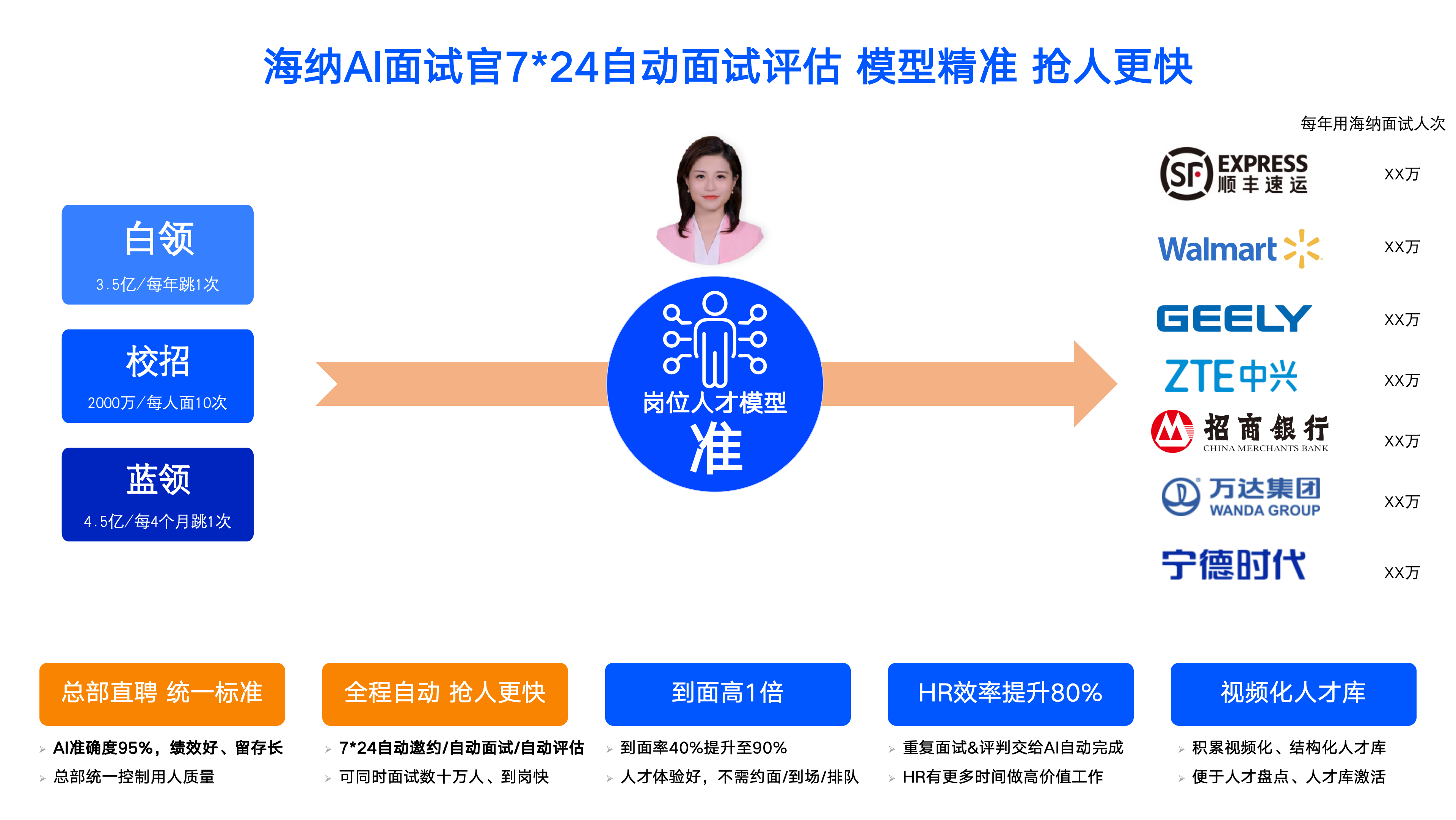 海纳AI聚焦打造AI面试测评平台,已为沃尔玛、顺丰、吉利、中兴通讯、招行等数十家500强企业面试超过700万人,7*24小时自动邀约、自动面试、自动评估、AI模型精准,尤其适合大规模蓝领招聘、校园招聘、白领初阶岗位招聘。