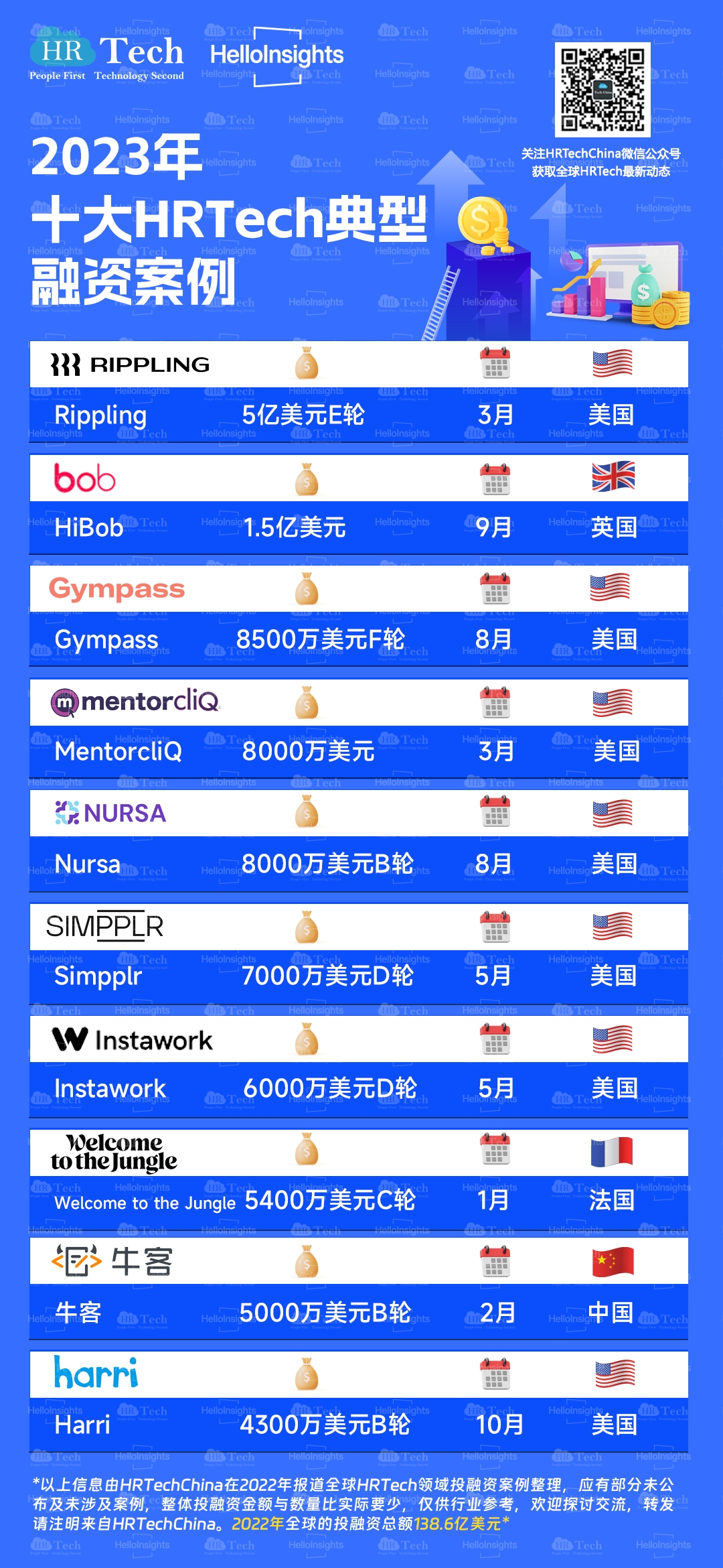 *以上信息由HRTech在2023年报道全球HRTech领域投融资案例整理,应有部分未公布及未涉及案例,整体投融资金额与数量比实际要少,仅供行业参考,欢迎探讨交流,转发请注明来自HRTech。
