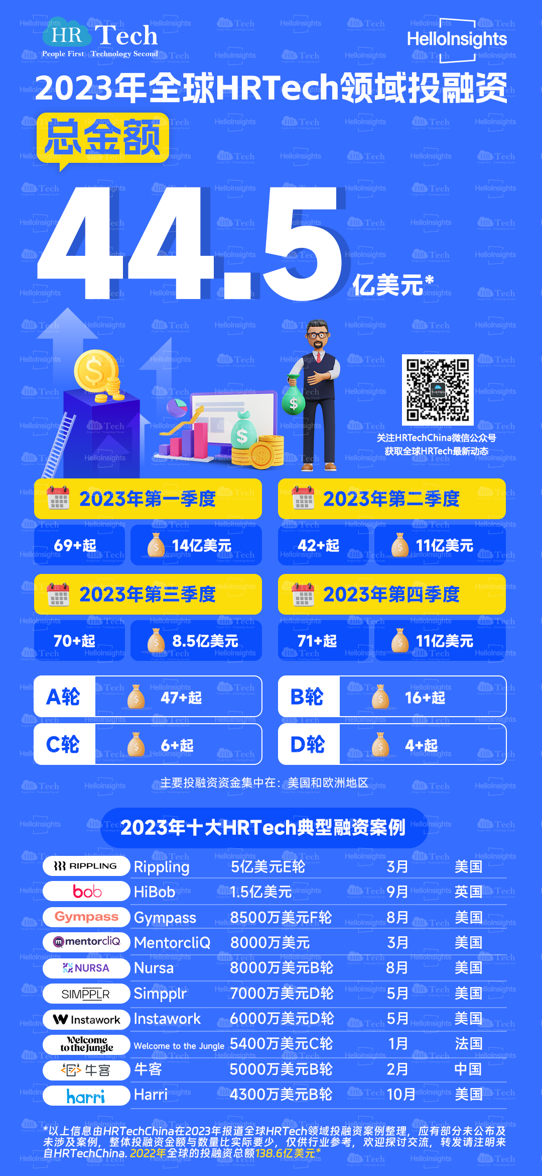 全球HRTech领域投融资总金额达44.5亿美元*。