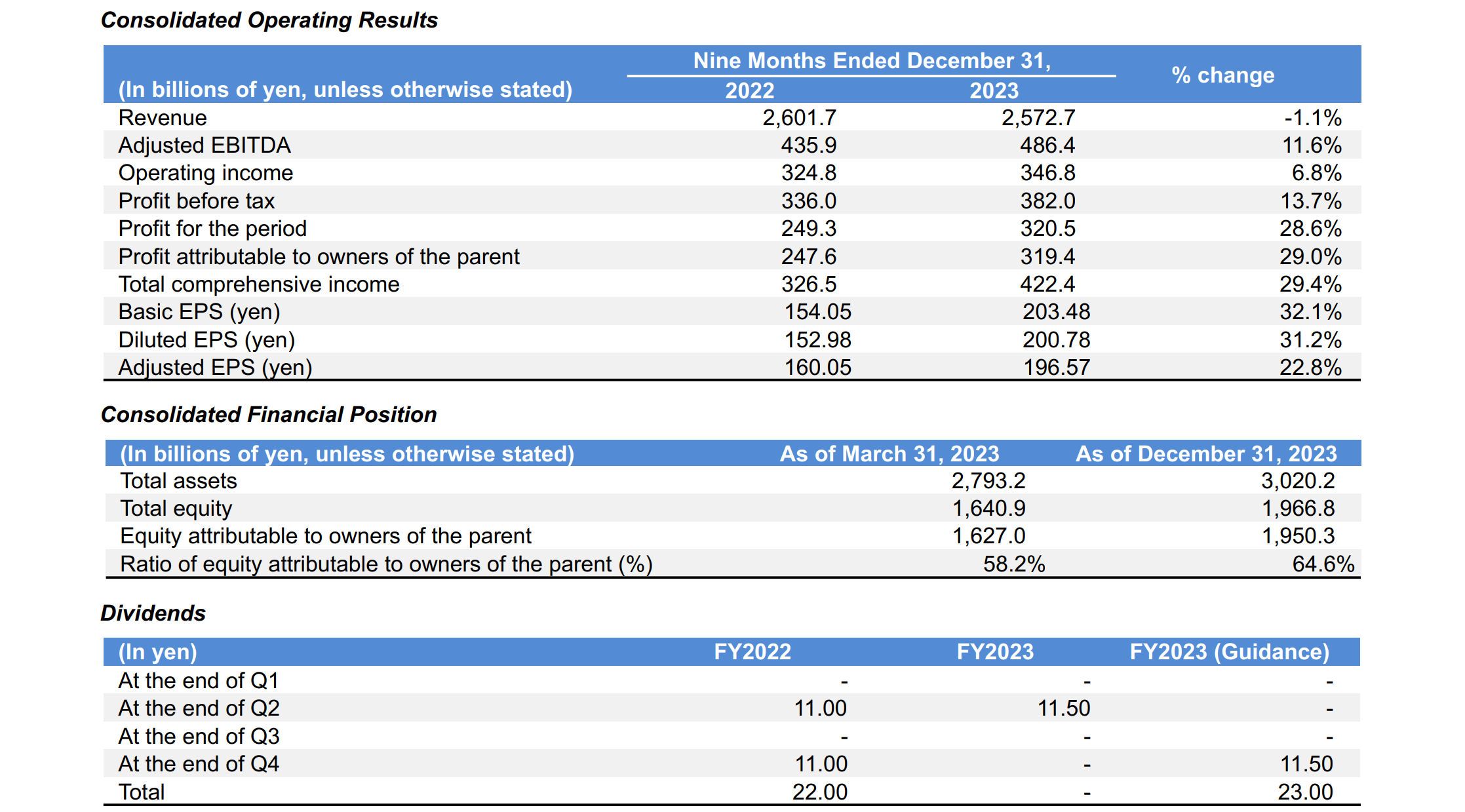 公司的经营收入和归属于母公司所有者的净利润均实现了显著增长。经营收入从上年的968亿日元增长到1089亿日元(约合7亿美元),增长率为12.5%。归属于母公司所有者的净利润更是从778亿日元激增至1063亿日元(约合7亿美元),同比增长36.6%。这一增长部分归功于HR Technology板块内部法律实体重组,导致所得税率降低,以及持续的成本控制措施,尽管人员配置板块记录了75亿日元(约合5020万美元)的商誉减值损失。