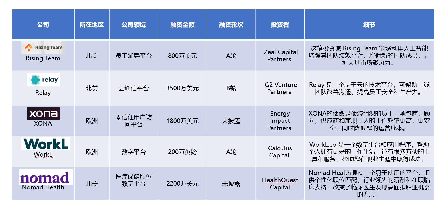 欧洲地区共报道了8投融资事件,融资金额最大的是比利时人工智能技能平台TechWolf获得4275万美元B轮融资。TechWolf先进的人工智能通过利用员工工作系统的数据来创建高质量的技能档案,而传统的应用程序只使用有限和孤立的人力资源数据。